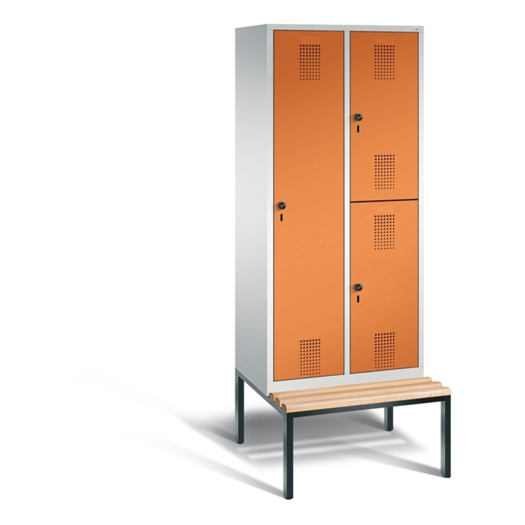 Stahl-Garderobenschrank Evolo, als Kombinationsschrank, 2 Abteile, Abteilbreite 400 mm, rechtes Abteil mit 2 Fächern, Korpus aus stabiler Stahlkonstruktion mit hochwertiger Einbrennbeschichtung für hohe UV- und Korrosionsbeständigkeit, linkes Abteil innen mit 1 Ablageboden, darunter 1 stabile Garderobenstange aus Ovalprofil mit 3 verdrehsicheren Schiebehaken, rechtes Abteil innen je Fach 1 stabile Garderobenstange aus Ovalprofil mit 3 verdrehsicheren Schiebehaken, Schrankboden hinten mit großflächigem Luftdurchlass für optimale Luftzirkulation, auf untergebauter Sitzbank, Gestell aus stabilem Vierkant-Stahlrohr 30 x 30 mm, mit verstellbaren Bodengleitern für einfachen Niveauausgleich, 3 Drehriegel für Vorhängeschlösser, Türen mit Anschlagsdämpfer und geschlossenen Seitenprofilen für höchste Stabilität und Einbruchsicherheit, mit reinigungsfreundlichem Belüftungslochbild oben und unten sowie eingeprägtem Etikettenrahmen, Türaufhängung in Drehbolzen, 1 Sitzleisten aus Buche-Hartholz, im Profil ca. 60 x 30 mm, allseitig gehobelt, oben abgerundet für guten Sitzkomfort, klarlackiert mit naturgegebenen Farbunterschieden, Maße (H x B x T): 2090 x 810 x 815 mm, Korpus: RAL 7035 Lichtgrau, Türen Stahl: RAL 2000 Gelborange, Gestell: RAL 7021 Schwarzgrau