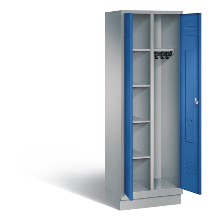 Stahl-Garderobenschrank Classic, als Mehrzweckschrank mit Mitteltrennwand, Abteilbreite 300 mm, Türen zueinanderschlagend für gemeinsamen Verschluss, Korpus aus stabiler Stahlkonstruktion mit hochwertiger Einbrennbeschichtung für hohe UV- und Korrosionsbeständigkeit, links 4 fest eingebaute Einlegeböden, rechts Ablageboden und stabile Garderobenstange aus Ovalprofil mit 3 verdrehsicheren Schiebehaken, Türen zueinanderschlagend für gemeinsamen Verschluss, auf 100 mm hohem Sockel, mit Kunststoffgleitern als praktischer Schrank- und Fußbodenschutz, vorne zurückgesetzt und oberhalb mit Luftdurchlass, 1 Drehriegel für Vorhangschloss, Türen mit Anschlagsdämpfer und mittiger Verstärkung für hohe Stabilität, mit Lüftungschlitzen oben und unten sowie eingestanztem Etikettenrahmen, Türaufhängung in Drehbolzen, Maße (H x B x T): 1800 x 610 x 500 mm, Korpus: RAL 9006 Weißaluminium, Türen Stahl: RAL 5010 Enzianblau, Inneneinrichtung: RAL 9006 Weißaluminium