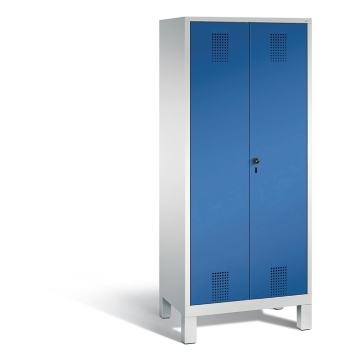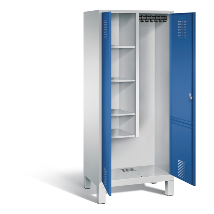 Raumpflege-Geräteschrank Evolo, Korpus aus stabiler Stahlkonstruktion mit hochwertiger Einbrennbeschichtung für hohe UV- und Korrosionsbeständigkeit, Türen zueinanderschlagend für gemeinsamen Verschluss, innen mit verkürzter Mitteltrennwand, links 4 fest eingebaute Böden, rechts 1 stabile Garderobenstange aus Ovalprofil mit 6 verdrehsicheren Schiebehaken, Schrankboden hinten mit großflächigem Luftdurchlass für optimale Luftzirkulation, auf 150 mm hohen Füßen aus Kunststoff für erweiterten Korrosionsschutz, mit integrierter Niveauregulierung und Schutzhülsen zur stilvollen Abdeckung der Verstellschrauben, bequem von innen und außen verstellbar, 1 Ergonomischer Sicherheits-Drehriegel für Vorhangschloss inkl. Tür-Schutz, Türen mit Anschlagsdämpfer und geschlossenen Seitenprofilen für höchste Stabilität und Einbruchsicherheit, mit reinigungsfreundlichem Belüftungslochbild oben und unten sowie eingeprägtem Etikettenrahmen, Türaufhängung in Drehbolzen, Maße (H x B x T): 1850 x 810 x 500 mm, Korpus: RAL 7035 Lichtgrau, Türen Stahl: RAL 5010 Enzianblau, Füße: RAL 7035 Lichtgrau