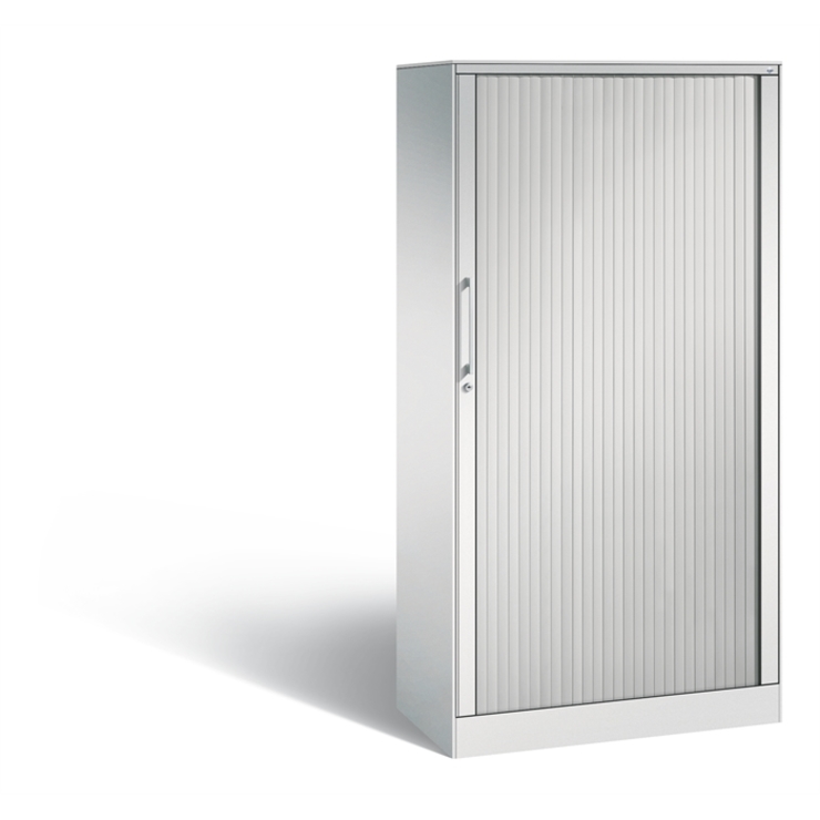 Stahl-Rollladenschrank Asisto, Korpus aus stabiler Stahlkonstruktion mit filigraner Kantenoptik und hochwertiger Einbrennbeschichtung für hohe UV-Beständigkeit, mit integrierter Niveauregulierung, bequem von innen bedienbar, hohe Flexibilität der Inneneinrichtung durch Höhenverstellbarkeit im 15 mm Raster, 1 Wechselzylinder matt vernickelt mit 2 Schlüsseln, 1 Ergonomischer Design-Bügelgriff für einfache Bedienung, aus Metall, matt vernickelt, 1 Abdeckplatte aus Stahl, 3 Einlegeböden aus Stahl lackiert, mit hoher mit hoher Traglast von 70 kg, RAL 7021 Anthrazit, Maße (H x B x T): 1639 x 800 x 435 mm, Korpus: RAL 7035 Lichtgrau, Rollladen: RAL 7035 Lichtgrau, Inneneinrichtung: RAL 7021 Schwarzgrau