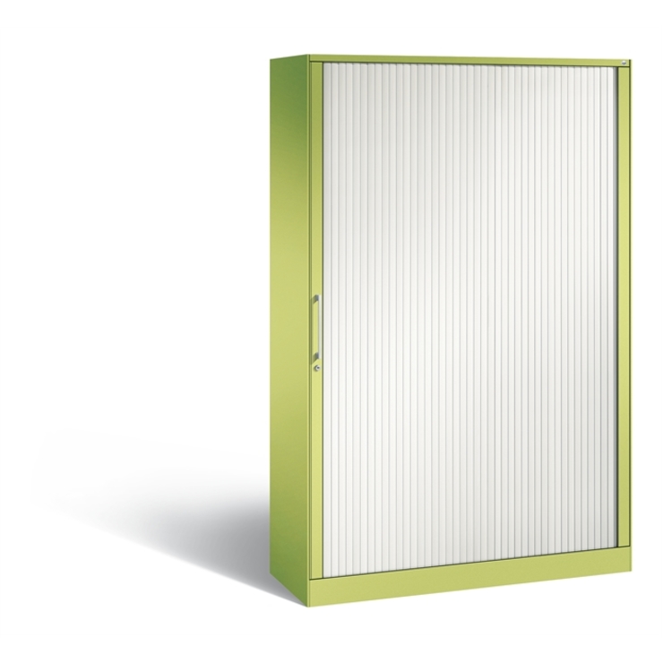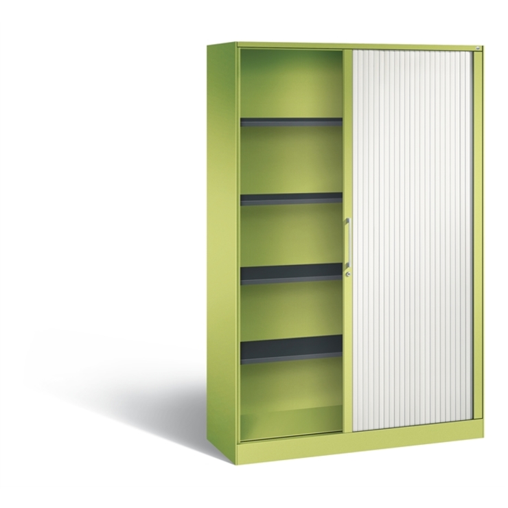 Stahl-Rollladenschrank Asisto, Korpus aus stabiler Stahlkonstruktion mit filigraner Kantenoptik und hochwertiger Einbrennbeschichtung für hohe UV-Beständigkeit, mit integrierter Niveauregulierung, bequem von innen bedienbar, hohe Flexibilität der Inneneinrichtung durch Höhenverstellbarkeit im 15 mm Raster, 1 Wechselzylinder matt vernickelt mit 2 Schlüsseln, 1 Ergonomischer Design-Bügelgriff für einfache Bedienung, aus Metall, matt vernickelt, 4 Einlegeböden aus Stahl lackiert, mit hoher mit hoher Traglast von 70 kg, RAL 7021 Anthrazit, Maße (H x B x T): 1980 x 1200 x 435 mm, Korpus: 1108060 RDS Viridingrün, Rollladen: RAL 9016 Verkehrsweiß, Inneneinrichtung: RAL 7021 Schwarzgrau