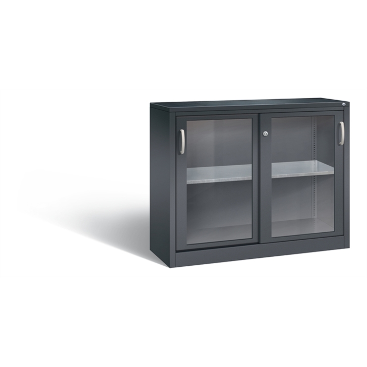 Stahl-Schiebetürenschrank Acurado-2000, Korpus aus stabiler Stahlkonstruktion mit hochwertiger Einbrennbeschichtung für hohe UV-Beständigkeit, mit Kunststoffgleitern als praktischer Schrank- und Fußbodenschutz, hohe Flexibilität der Inneneinrichtung durch Höhenverstellbarkeit im 15 mm Raster, Türen mit Sichtfenster aus Acrylglas für direkten Einblick, mit geschlossenen Seitenprofilen für höchste Stabilität, leichtgängige Bedienung durch Leichtlaufrollen in spezieller Schienenführung, 1 Wechselzylinder matt vernickelt mit 2 Schlüsseln, 2 Ergonomische Bügelgriffe Ergolock aus Metall für einfache Bedienung, matt vernickelt, 1 Einlegeboden aus Stahl, verzinkt, mit hoher Traglast 70 kg, 1 Gummiriefenmatte, Maße (H x B x T): 1000 x 1200 x 400 mm, Korpus: RAL 7021 Schwarzgrau, Türen: RAL 7021 Schwarzgrau