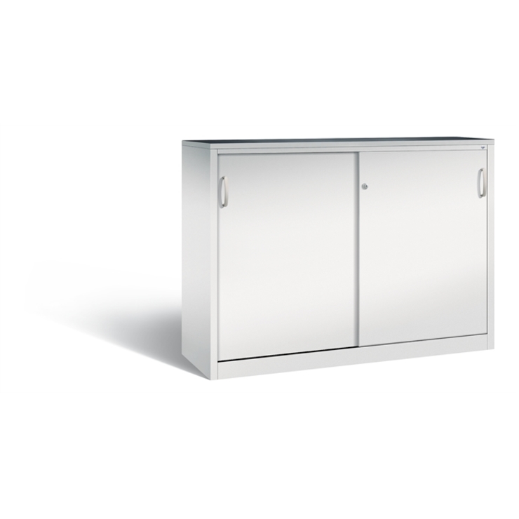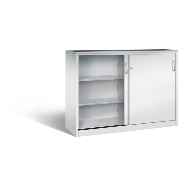 Stahl-Schiebetürenschrank Asisto, Korpus aus stabiler Stahlkonstruktion mit filigraner Kantenoptik und hochwertiger Einbrennbeschichtung für hohe UV-Beständigkeit, mit integrierter Niveauregulierung, bequem von innen bedienbar, hohe Flexibilität der Inneneinrichtung durch Höhenverstellbarkeit im 15 mm Raster, 1 Wechselzylinder matt vernickelt mit 2 Schlüsseln, 2 Ergonomische Design-Bügelgriffe für einfache Bedienung, aus Metall, matt vernickelt, 2 Stahltüren doppelwandig, gedämmt für... (mehr)? Papersmart hilft Ihnen, den besten Anbieter für Ihren gesamten Warenkorb zu ermitteln.