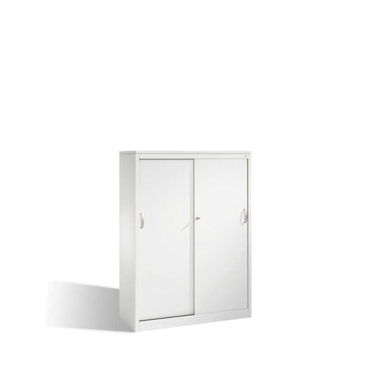 Stahl-Schiebetürenschrank Acurado-2000, Korpus aus stabiler Stahlkonstruktion mit hochwertiger Einbrennbeschichtung für hohe UV-Beständigkeit, mit Kunststoffgleitern als praktischer Schrank- und Fußbodenschutz, hohe Flexibilität der Inneneinrichtung durch Höhenverstellbarkeit im 15 mm Raster, Türen verstärkt für hohe Stabilität, leichtgängige Bedienung durch Leichtlaufrollen in spezieller Schienenführung, 1 Wechselzylinder matt vernickelt mit 2 Schlüsseln, 2 Ergonomische Bügelgriffe Ergolock aus Metall für einfache Bedienung, matt vernickelt, 3 Einlegeböden aus Stahl, lackiert, mit hoher Traglast 70 kg, 1 Abdeckplatte 25 mm aus direktbeschichteter Spanplatte (DBS), Maße (H x B x T): 1600 x 1200 x 500 mm, Korpus: RAL 7035 Lichtgrau, Türen: RAL 7035 Lichtgrau, Inneneinrichtung: RAL 7035 Lichtgrau, Abdeckplatte DBS: Dekor Hellgrau