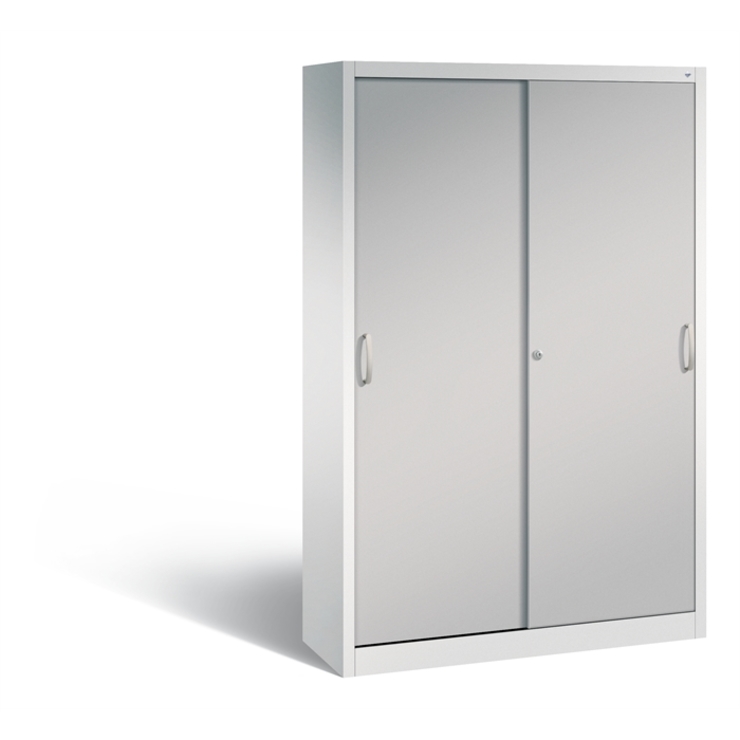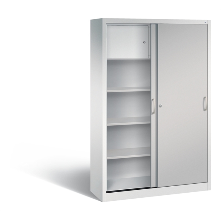 Stahl-Schiebetürenschrank Acurado-2000, Korpus aus stabiler Stahlkonstruktion mit hochwertiger Einbrennbeschichtung für hohe UV-Beständigkeit, mit Kunststoffgleitern als praktischer Schrank- und Fußbodenschutz, hohe Flexibilität der Inneneinrichtung durch Höhenverstellbarkeit im 15 mm Raster, Türen verstärkt für hohe Stabilität, leichtgängige Bedienung durch Leichtlaufrollen in spezieller Schienenführung, 1 Wechselzylinder matt vernickelt mit 2 Schlüsseln, 2 Ergonomische Bügelgriffe Ergolock aus Metall für einfache Bedienung, matt vernickelt, 3 Einlegeböden aus Stahl, lackiert, mit hoher Traglast 70 kg, 1 Schließfach mit Drehtüren und 2 einzeln abschließbaren Fächern über Zylinderschloss, Maße (H x B x T): 1950 x 1200 x 400 mm, Korpus: RAL 7035 Lichtgrau, Türen: RAL 9006 Weißaluminium, Inneneinrichtung: RAL 7035 Lichtgrau