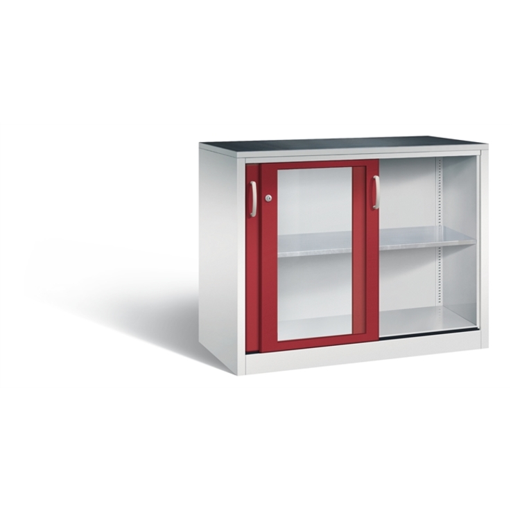 Stahl-Schiebetürenschrank Acurado-2000, Korpus aus stabiler Stahlkonstruktion mit hochwertiger Einbrennbeschichtung für hohe UV-Beständigkeit, mit Kunststoffgleitern als praktischer Schrank- und Fußbodenschutz, hohe Flexibilität der Inneneinrichtung durch Höhenverstellbarkeit im 15 mm Raster, Türen mit Sichtfenster aus Acrylglas für direkten Einblick, mit geschlossenen Seitenprofilen für höchste Stabilität, leichtgängige Bedienung durch Leichtlaufrollen in spezieller Schienenführung, 1 Wechselzylinder matt vernickelt mit 2 Schlüsseln, 2 Ergonomische Bügelgriffe Ergolock aus Metall für einfache Bedienung, matt vernickelt, 4 Einlegeböden aus Stahl, verzinkt, mit hoher Traglast 70 kg, Maße (H x B x T): 1950 x 1200 x 500 mm, Korpus: RAL 7035 Lichtgrau, Türen: RAL 3003 Rubinrot