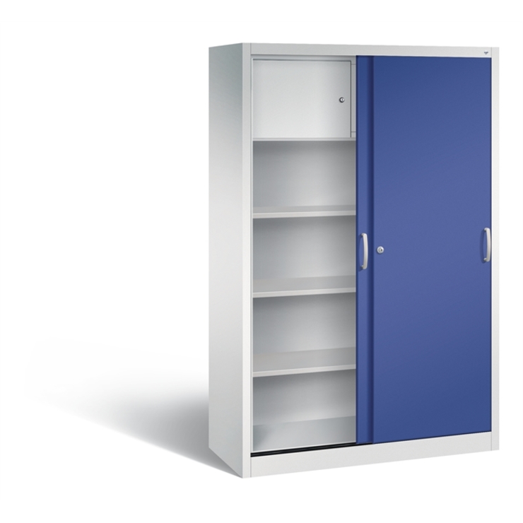 Stahl-Schiebetürenschrank Acurado-2000, Korpus aus stabiler Stahlkonstruktion mit hochwertiger Einbrennbeschichtung für hohe UV-Beständigkeit, mit Kunststoffgleitern als praktischer Schrank- und Fußbodenschutz, hohe Flexibilität der Inneneinrichtung durch Höhenverstellbarkeit im 15 mm Raster, Türen verstärkt für hohe Stabilität, leichtgängige Bedienung durch Leichtlaufrollen in spezieller Schienenführung, 1 Wechselzylinder matt vernickelt mit 2 Schlüsseln, 2 Ergonomische Bügelgriffe Ergolock aus Metall für einfache Bedienung, matt vernickelt, 3 Einlegeböden aus Stahl, lackiert, mit hoher Traglast 70 kg, 1 Schließfach mit Drehtüren und 2 einzeln abschließbaren Fächern über Zylinderschloss, Maße (H x B x T): 1950 x 1200 x 500 mm, Korpus: RAL 7035 Lichtgrau, Türen: 2702029 RDS Lapisblau, Inneneinrichtung: RAL 7035 Lichtgrau