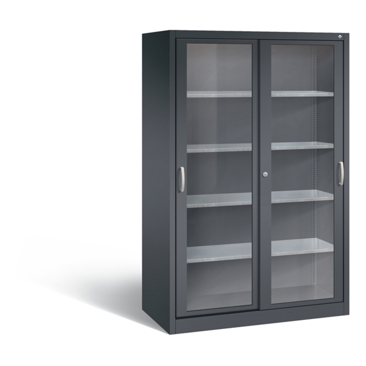 Stahl-Schiebetürenschrank Acurado-2000, Korpus aus stabiler Stahlkonstruktion mit hochwertiger Einbrennbeschichtung für hohe UV-Beständigkeit, mit Kunststoffgleitern als praktischer Schrank- und Fußbodenschutz, hohe Flexibilität der Inneneinrichtung durch Höhenverstellbarkeit im 15 mm Raster, Türen mit Sichtfenster aus Acrylglas für direkten Einblick, mit geschlossenen Seitenprofilen für höchste Stabilität, leichtgängige Bedienung durch Leichtlaufrollen in spezieller Schienenführung, 1 Wechselzylinder matt vernickelt mit 2 Schlüsseln, 2 Ergonomische Bügelgriffe Ergolock aus Metall für einfache Bedienung, matt vernickelt, 4 Einlegeböden aus Stahl, verzinkt, mit hoher Traglast 70 kg, Maße (H x B x T): 1950 x 1200 x 600 mm, Korpus: RAL 7021 Schwarzgrau, Türen: RAL 7021 Schwarzgrau