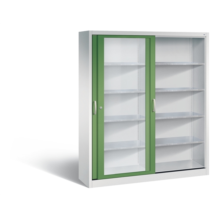Stahl-Schiebetürenschrank Acurado-2000, Korpus aus stabiler Stahlkonstruktion mit hochwertiger Einbrennbeschichtung für hohe UV-Beständigkeit, mit Kunststoffgleitern als praktischer Schrank- und Fußbodenschutz, hohe Flexibilität der Inneneinrichtung durch Höhenverstellbarkeit im 15 mm Raster, Türen mit Sichtfenster aus Acrylglas für direkten Einblick, mit geschlossenen Seitenprofilen für höchste Stabilität, leichtgängige Bedienung durch Leichtlaufrollen in spezieller Schienenführung, 1 Wechselzylinder matt vernickelt mit 2 Schlüsseln, 2 Ergonomische Bügelgriffe Ergolock aus Metall für einfache Bedienung, matt vernickelt, 8 Einlegeböden aus Stahl, verzinkt, mit hoher Traglast 70 kg, Maße (H x B x T): 1950 x 1600 x 400 mm, Korpus: RAL 7035 Lichtgrau, Türen: RAL 6011 Resedagrün