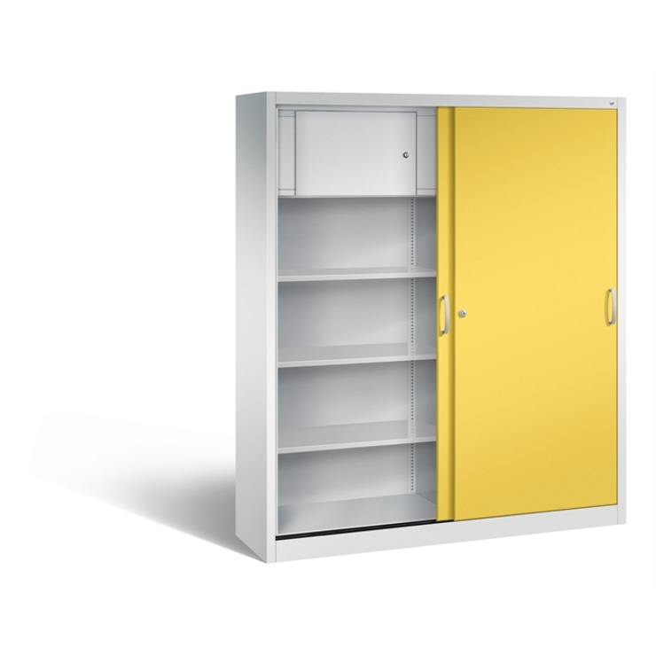 Stahl-Schiebetürenschrank Acurado-2000, Korpus aus stabiler Stahlkonstruktion mit hochwertiger Einbrennbeschichtung für hohe UV-Beständigkeit, mit Kunststoffgleitern als praktischer Schrank- und Fußbodenschutz, hohe Flexibilität der Inneneinrichtung durch Höhenverstellbarkeit im 15 mm Raster, Türen verstärkt für hohe Stabilität, leichtgängige Bedienung durch Leichtlaufrollen in spezieller Schienenführung, mit Mitteltrennwand, 1 Wechselzylinder matt vernickelt mit 2 Schlüsseln, 2 Ergonomische Bügelgriffe Ergolock aus Metall für einfache Bedienung, matt vernickelt, 6 Einlegeböden aus Stahl, lackiert, mit hoher Traglast 70 kg, 1 Schließfach mit Drehtüren und 2 einzeln abschließbaren Fächern über Zylinderschloss, Maße (H x B x T): 1950 x 1600 x 400 mm, Korpus: RAL 7035 Lichtgrau, Türen: 0808060 RDS Sonnengelb, Inneneinrichtung: RAL 7035 Lichtgrau