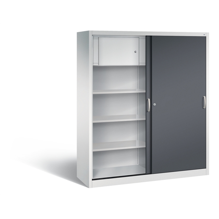 Stahl-Schiebetürenschrank Acurado-2000, als Aufsatzschrank, Korpus aus stabiler Stahlkonstruktion mit hochwertiger Einbrennbeschichtung für hohe UV-Beständigkeit, mit Kunststoffgleitern als praktischer Schrank- und Fußbodenschutz, hohe Flexibilität der Inneneinrichtung durch Höhenverstellbarkeit im 15 mm Raster, Türen verstärkt für hohe Stabilität, leichtgängige Bedienung durch Leichtlaufrollen in spezieller Schienenführung, 1 Wechselzylinder matt vernickelt mit 2 Schlüsseln, 2... (mehr)? Papersmart hilft Ihnen, den besten Anbieter für Ihren gesamten Warenkorb zu ermitteln.