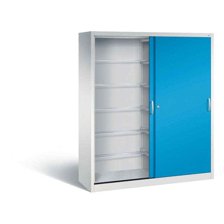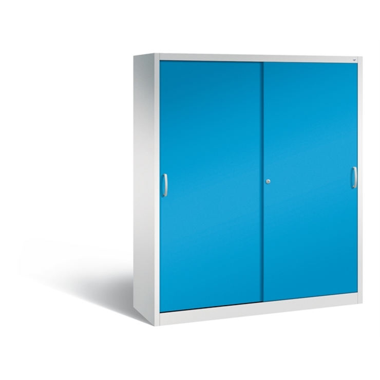 Stahl-Schiebetürenschrank Acurado-2000, Korpus aus stabiler Stahlkonstruktion mit hochwertiger Einbrennbeschichtung für hohe UV-Beständigkeit, mit Kunststoffgleitern als praktischer Schrank- und Fußbodenschutz, hohe Flexibilität der Inneneinrichtung durch Höhenverstellbarkeit im 15 mm Raster, Türen verstärkt für hohe Stabilität, leichtgängige Bedienung durch Leichtlaufrollen in spezieller Schienenführung, mit Mitteltrennwand, 1 Wechselzylinder matt vernickelt mit 2 Schlüsseln, 2 Ergonomische Bügelgriffe Ergolock aus Metall für einfache Bedienung, matt vernickelt, 12 Pendelstangen für Pendelmappen System Elba/Leitz, Maße (H x B x T): 1950 x 1600 x 500 mm, Korpus: RAL 7035 Lichtgrau, Türen: RAL 5012 Lichtblau, Inneneinrichtung: RAL 7035 Lichtgrau
