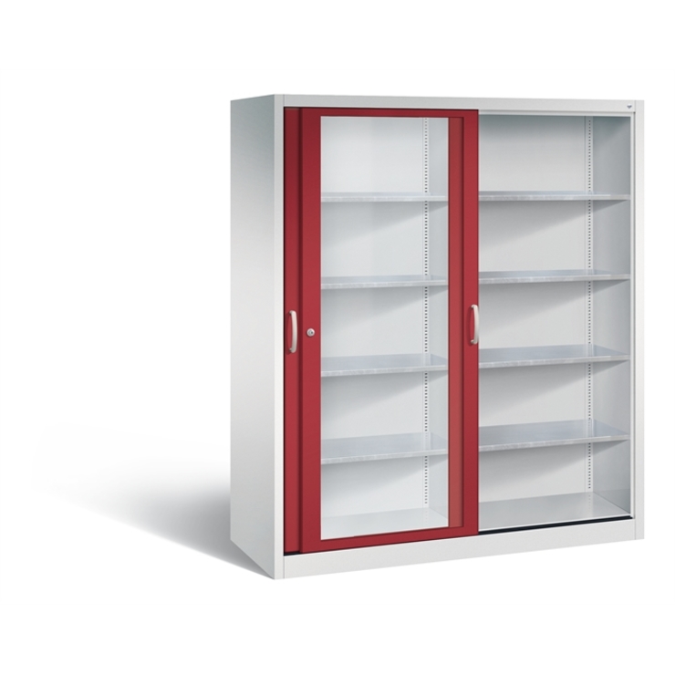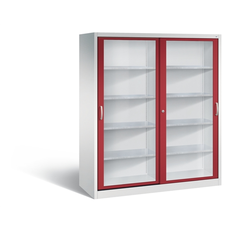 Stahl-Schiebetürenschrank Acurado-2000, Korpus aus stabiler Stahlkonstruktion mit hochwertiger Einbrennbeschichtung für hohe UV-Beständigkeit, mit Kunststoffgleitern als praktischer Schrank- und Fußbodenschutz, hohe Flexibilität der Inneneinrichtung durch Höhenverstellbarkeit im 15 mm Raster, Türen mit Sichtfenster aus Acrylglas für direkten Einblick, mit geschlossenen Seitenprofilen für höchste Stabilität, leichtgängige Bedienung durch Leichtlaufrollen in spezieller Schienenführung, 1 Wechselzylinder matt vernickelt mit 2 Schlüsseln, 2 Ergonomische Bügelgriffe Ergolock aus Metall für einfache Bedienung, matt vernickelt, 8 Einlegeböden aus Stahl, verzinkt, mit hoher Traglast 70 kg, Maße (H x B x T): 1950 x 1600 x 600 mm, Korpus: RAL 7035 Lichtgrau, Türen: RAL 3003 Rubinrot