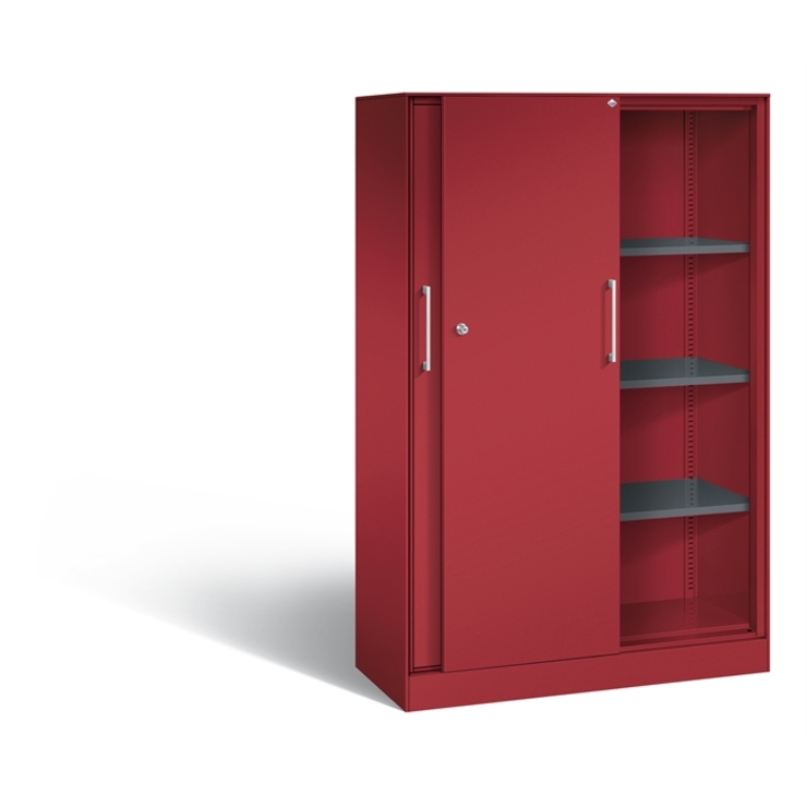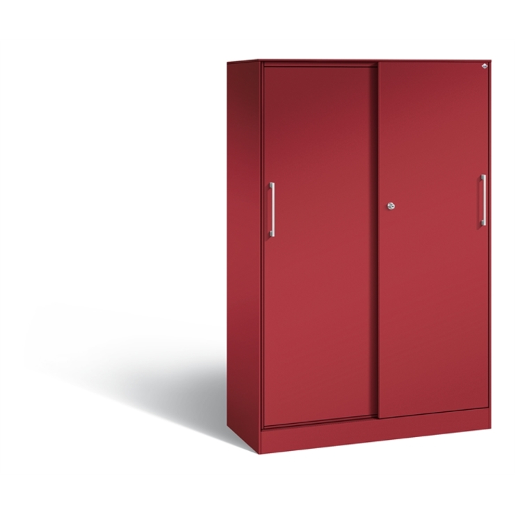 Stahl-Schiebetürenschrank Asisto, Korpus aus stabiler Stahlkonstruktion mit filigraner Kantenoptik und hochwertiger Einbrennbeschichtung für hohe UV-Beständigkeit, mit integrierter Niveauregulierung, bequem von innen bedienbar, hohe Flexibilität der Inneneinrichtung durch Höhenverstellbarkeit im 15 mm Raster, 1 Wechselzylinder matt vernickelt mit 2 Schlüsseln, 2 Ergonomische Design-Bügelgriffe für einfache Bedienung, aus Metall, matt vernickelt, 1 Abdeckplatte aus Stahl, 2 Stahltüren doppelwandig, gedämmt für angenehmes Geräuschverhalten, leichtgängige Bedienung durch Leichtlaufrollen in spezieller Schienenführung, 3 Einlegeböden aus Stahl lackiert, mit hoher Traglast von 70 kg, Maße (H x B x T): 1635 x 1000 x 435 mm, Korpus: RAL 3003 Rubinrot, Türen: RAL 3003 Rubinrot, Inneneinrichtung: RAL 7021 Schwarzgrau