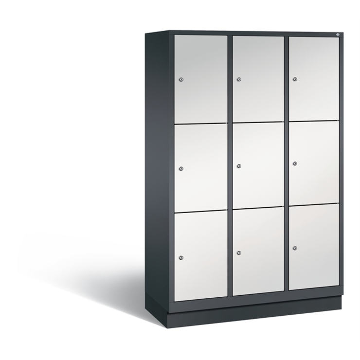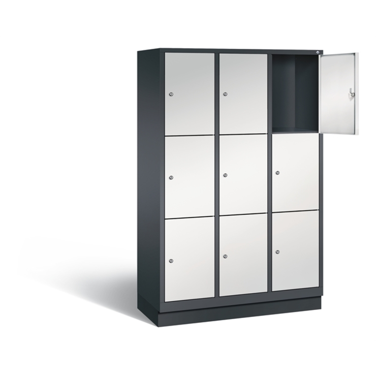 Stahl-Fächerschrank Classic, 3 Abteile mit 3 Fächern, Abteilbreite 400 mm, Korpus aus stabiler Stahlkonstruktion mit hochwertiger Einbrennbeschichtung für hohe UV- und Korrosionsbeständigkeit, auf 100 mm hohem Sockel, mit Kunststoffgleitern als praktischer Schrank- und Fußbodenschutz, vorne zurückgesetzt, 9 Zylinderschlösser mit je 2 Schlüsseln, Schließkreis bis 1000 verschiedene Schließungen, Türen mit Anschlagsdämpfer, Türaufhängung in Drehbolzen, Maße (H x B x T): 1800 x 1200 x 500 mm, Korpus: RAL 7021 Schwarzgrau, Türen Stahl: RAL 7035 Lichtgrau