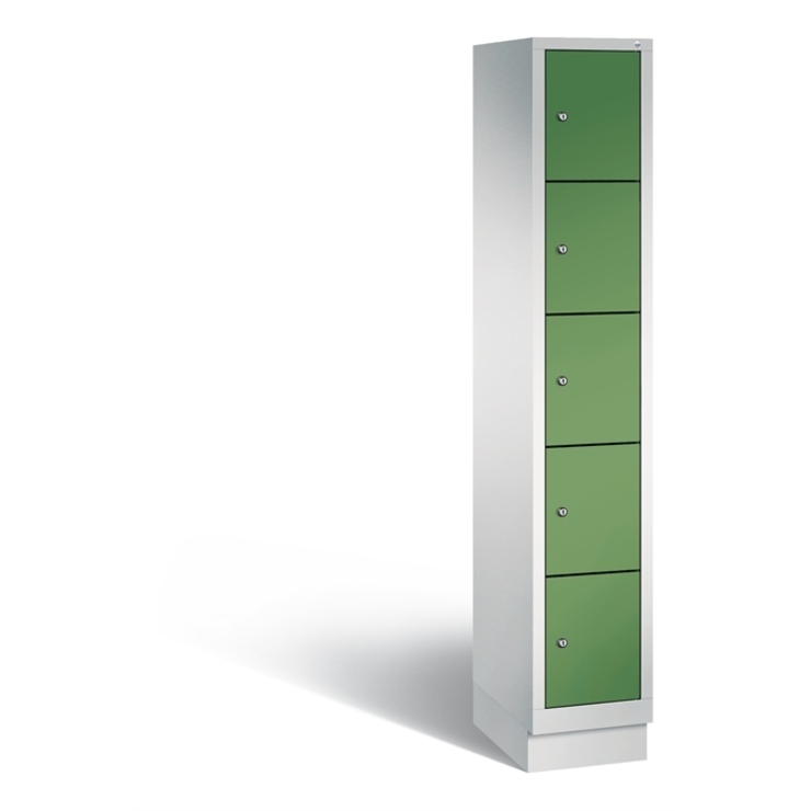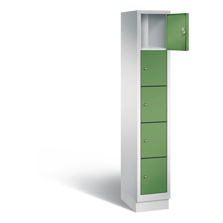 Stahl-Fächerschrank Classic, 1 Abteil mit 5 Fächern, Abteilbreite 300 mm, Korpus aus stabiler Stahlkonstruktion mit hochwertiger Einbrennbeschichtung für hohe UV- und Korrosionsbeständigkeit, auf 100 mm hohem Sockel, mit Kunststoffgleitern als praktischer Schrank- und Fußbodenschutz, vorne zurückgesetzt, 5 Zylinderschlösser mit je 2 Schlüsseln, Schließkreis bis 1000 verschiedene Schließungen, Türen mit Anschlagsdämpfer, Türaufhängung in Drehbolzen, Maße (H x B x T): 1800 x 320 x 500 mm, Korpus: RAL 7035 Lichtgrau, Türen Stahl: RAL 6011 Resedagrün