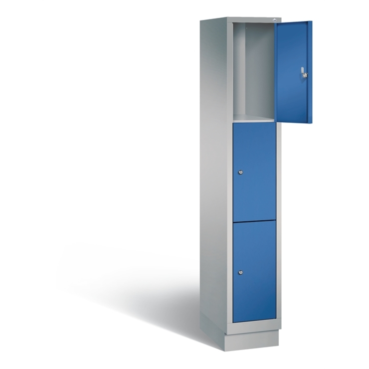 Stahl-Fächerschrank Classic, 1 Abteil mit 3 Fächern, Abteilbreite 300 mm, Korpus aus stabiler Stahlkonstruktion mit hochwertiger Einbrennbeschichtung für hohe UV- und Korrosionsbeständigkeit, auf 100 mm hohem Sockel, mit Kunststoffgleitern als praktischer Schrank- und Fußbodenschutz, vorne zurückgesetzt, 3 Zylinderschlösser mit je 2 Schlüsseln, Schließkreis bis 1000 verschiedene Schließungen, Türen mit Anschlagsdämpfer, Türaufhängung in Drehbolzen, Maße (H x B x T): 1800 x 320 x 500 mm, Korpus: RAL 9006 Weißaluminium, Türen Stahl: RAL 5010 Enzianblau