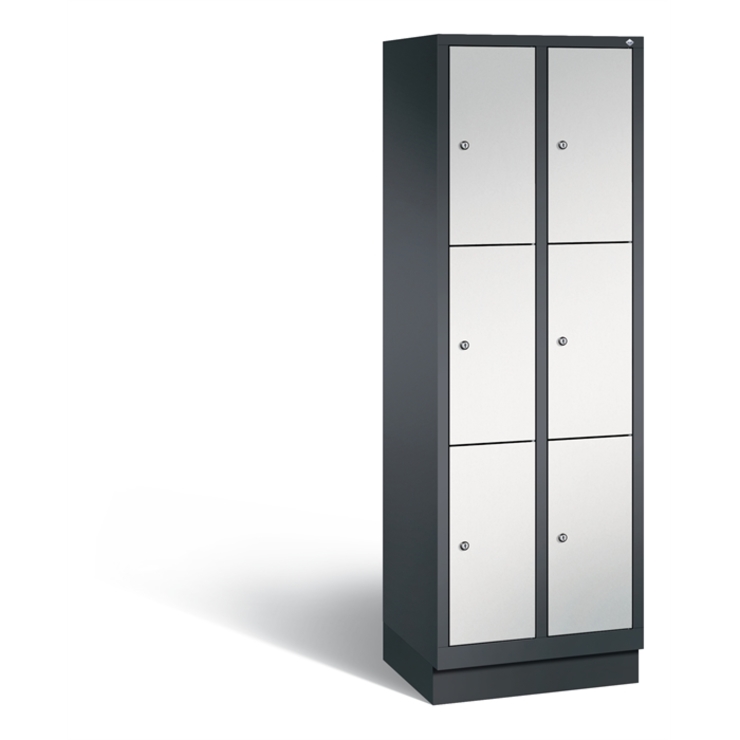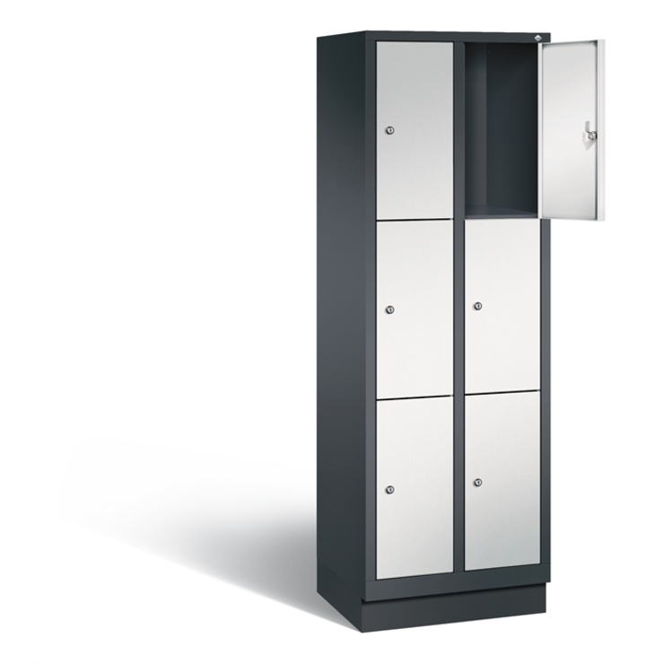 Stahl-Fächerschrank Classic, 2 Abteile mit 3 Fächern, Abteilbreite 300 mm, Korpus aus stabiler Stahlkonstruktion mit hochwertiger Einbrennbeschichtung für hohe UV- und Korrosionsbeständigkeit, auf 100 mm hohem Sockel, mit Kunststoffgleitern als praktischer Schrank- und Fußbodenschutz, vorne zurückgesetzt, 6 Zylinderschlösser mit je 2 Schlüsseln, Schließkreis bis 1000 verschiedene Schließungen, Türen mit Anschlagsdämpfer, Türaufhängung in Drehbolzen, Maße (H x B x T): 1800 x 610 x 500 mm, Korpus: RAL 7021 Schwarzgrau, Türen Stahl: RAL 7035 Lichtgrau