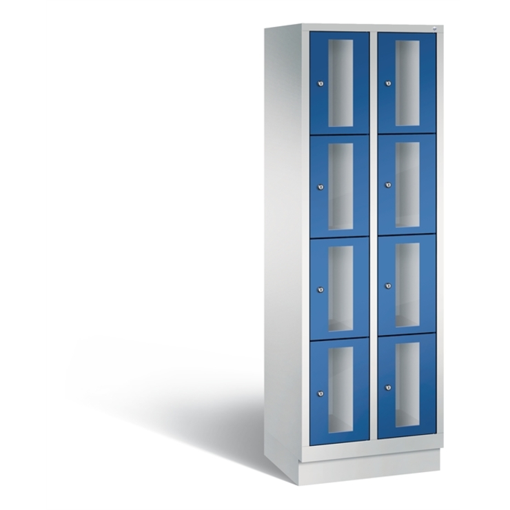 Stahl-Fächerschrank Classic, 2 Abteile mit 4 Fächern, Abteilbreite 300 mm, Korpus aus stabiler Stahlkonstruktion mit hochwertiger Einbrennbeschichtung für hohe UV- und Korrosionsbeständigkeit, auf 100 mm hohem Sockel, mit Kunststoffgleitern als praktischer Schrank- und Fußbodenschutz, vorne zurückgesetzt, 8 Zylinderschlösser mit je 2 Schlüsseln, Schließkreis bis 1000 verschiedene Schließungen, 1 Türen mit Sichtfenster aus Acrylglas für direkten Einblick, Türaufhängung in Drehbolzen mit Öffnungswinkel von ca. 110 Grad, inkl. Anschlagsdämpfer für angenehmes Schließverhalten, Maße (H x B x T): 1800 x 610 x 500 mm, Korpus: RAL 7035 Lichtgrau, Türen Stahl: RAL 5010 Enzianblau