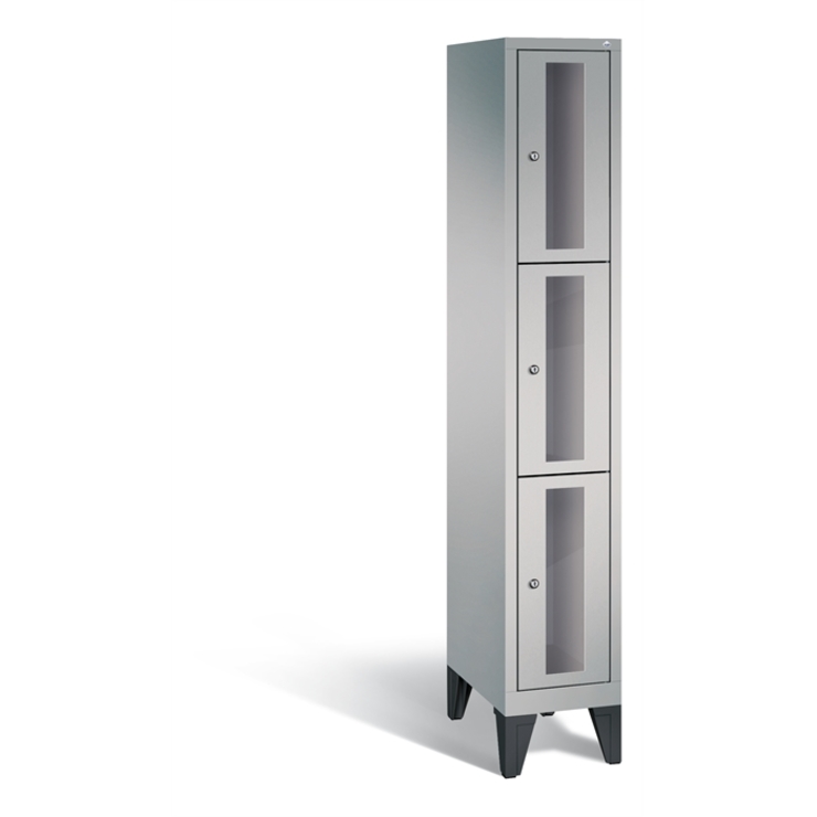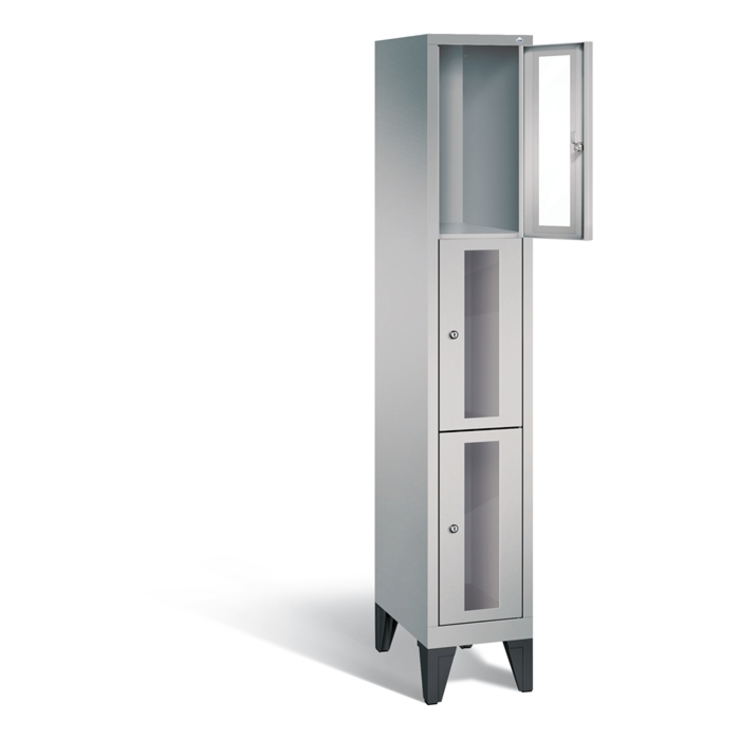 Stahl-Fächerschrank Classic, 1 Abteil mit 3 Fächern, Abteilbreite 300 mm, Korpus aus stabiler Stahlkonstruktion mit hochwertiger Einbrennbeschichtung für hohe UV- und Korrosionsbeständigkeit, auf 150 mm hohen Füßen aus Kunststoff für erweiterten Korrosionsschutz, 3 Zylinderschlösser mit je 2 Schlüsseln, Schließkreis bis 1000 verschiedene Schließungen, 1 Türen mit Sichtfenster aus Acrylglas für direkten Einblick, Türaufhängung in Drehbolzen mit Öffnungswinkel von ca. 110 Grad, inkl. Anschlagsdämpfer für angenehmes Schließverhalten, Maße (H x B x T): 1850 x 320 x 500 mm, Korpus: RAL 9006 Weißaluminium, Türen Stahl: RAL 9006 Weißaluminium, Füße: RAL 9005 Tiefschwarz