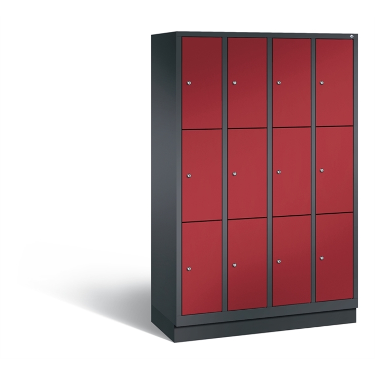 Stahl-Fächerschrank Evolo, 4 Abteile mit je 3 Fächern, Abteilbreite 300 mm, Korpus aus stabiler Stahlkonstruktion mit hochwertiger Einbrennbeschichtung für hohe UV- und Korrosionsbeständigkeit, auf 100 mm hohem Sockel, mit Kunststoffgleitern als praktischer Schrank- und Fußbodenschutz, vorne zurückgesetzt, 12 Zylinderschlösser mit je 2 Schlüsseln, Schließkreis bis 1000 verschiedene Schließungen, Türen mit Anschlagsdämpfer, Türaufhängung in Drehbolzen, Maße (H x B x T): 1800 x 1190 x 500 mm, Korpus: RAL 7021 Schwarzgrau, Türen Stahl: RAL 3003 Rubinrot