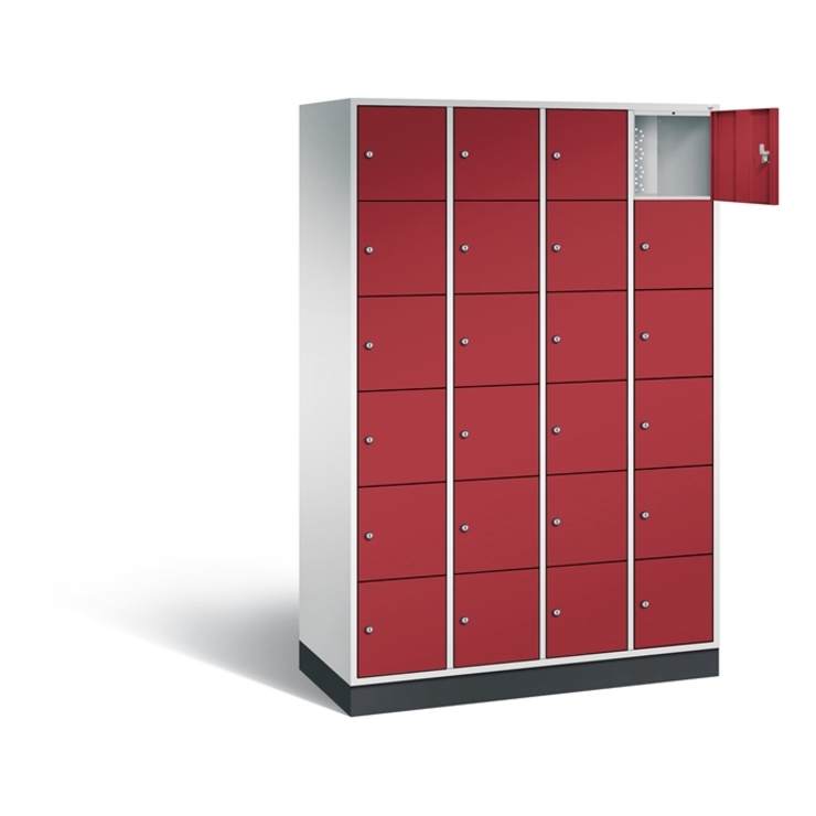 Stahl-Schließfachschrank Intro, 4 Abteile mit 6 Fächern, Abteilbreite 300 mm, Korpus aus stabiler Stahlkonstruktion mit hochwertiger Einbrennbeschichtung für hohe UV- und Korrosionsbeständigkeit, Türen doppelwandig für hohe Stabilität, mit Anschlagsdämpfer, Türaufhängung durchgängig mit robustem Scharnierband, rechts angeschlagen, Rückwand mit großflächigem Luftdurchlass und 18 mm Wandabstandshaltern, auf 100 mm hohem Sockel, 24 Zylinderschlösser mit je 2 Schlüsseln, Schließkreis bis 1000 verschiedene Schließungen, Maße (H x B x T): 1950 x 1220 x 490 mm, Korpus: RAL 7035 Lichtgrau, Türen: RAL 3003 Rubinrot, Sockel: RAL 7021 Schwarzgrau