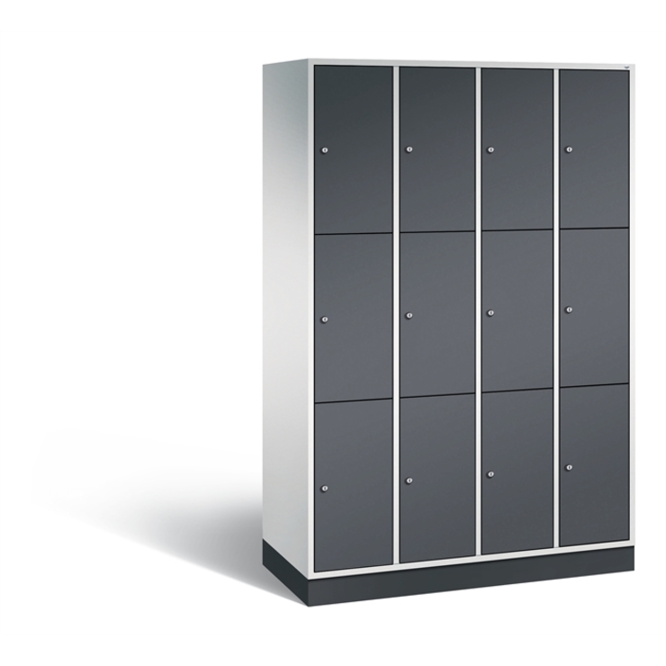 Stahl-Schließfachschrank Intro, 4 Abteile mit 3 Fächern, Abteilbreite 300 mm, Korpus aus stabiler Stahlkonstruktion mit hochwertiger Einbrennbeschichtung für hohe UV- und Korrosionsbeständigkeit, Türen verstärkt für hohe Stabilität, mit Anschlagsdämpfer, Türaufhängung durchgängig mit robustem Scharnierband, rechts angeschlagen, Rückwand mit großflächigem Luftdurchlass und 18 mm Wandabstandshaltern, auf 100 mm hohem Sockel, 12 Zylinderschlösser mit je 2 Schlüsseln, Schließkreis bis 1000 verschiedene Schließungen, Maße (H x B x T): 1950 x 1220 x 490 mm, Korpus: RAL 7035 Lichtgrau, Türen: RAL 7021 Schwarzgrau, Sockel: RAL 7021 Schwarzgrau