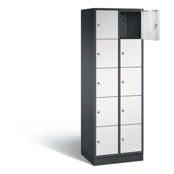 Stahl-Schließfachschrank Intro, 2 Abteile mit 5 Fächern, Abteilbreite 300 mm, Korpus aus stabiler Stahlkonstruktion mit hochwertiger Einbrennbeschichtung für hohe UV- und Korrosionsbeständigkeit, Türen doppelwandig für hohe Stabilität, mit Anschlagsdämpfer, Türaufhängung durchgängig mit robustem Scharnierband, rechts angeschlagen, Rückwand mit großflächigem Luftdurchlass und 18 mm Wandabstandshaltern, auf 100 mm hohem Sockel, 10 Zylinderschlösser mit je 2 Schlüsseln, Schließkreis bis 1000 verschiedene Schließungen, Maße (H x B x T): 1950 x 620 x 490 mm, Korpus: RAL 7021 Schwarzgrau, Türen: RAL 7035 Lichtgrau, Sockel: RAL 7021 Schwarzgrau