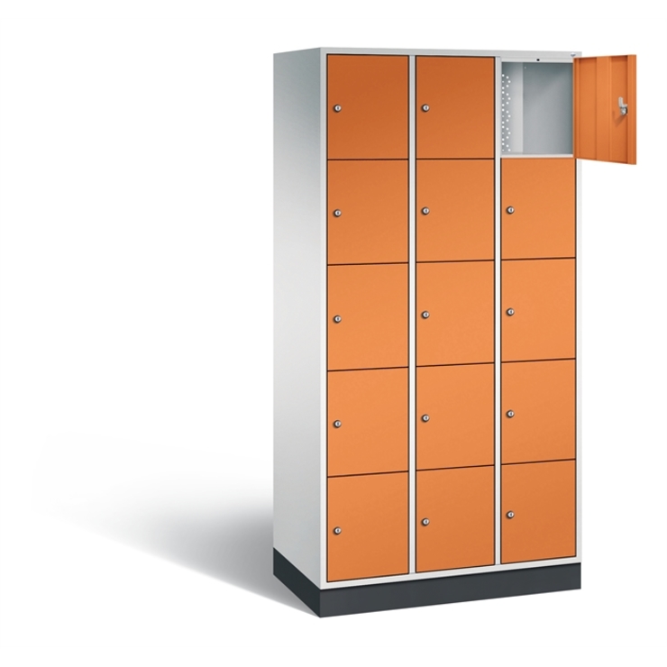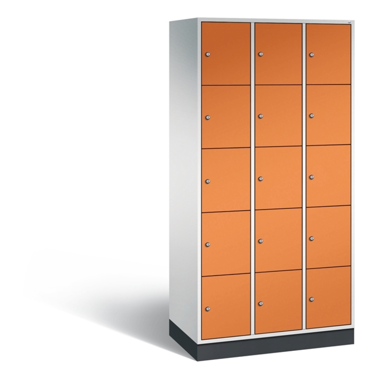 Stahl-Schließfachschrank Intro, 3 Abteile mit 5 Fächern, Abteilbreite 300 mm, Korpus aus stabiler Stahlkonstruktion mit hochwertiger Einbrennbeschichtung für hohe UV- und Korrosionsbeständigkeit, Türen doppelwandig für hohe Stabilität, mit Anschlagsdämpfer, Türaufhängung durchgängig mit robustem Scharnierband, rechts angeschlagen, Rückwand mit großflächigem Luftdurchlass und 18 mm Wandabstandshaltern, auf 100 mm hohem Sockel, 15 Zylinderschlösser mit je 2 Schlüsseln, Schließkreis bis 1000 verschiedene Schließungen, Maße (H x B x T): 1950 x 920 x 490 mm, Korpus: RAL 7035 Lichtgrau, Türen: RAL 2000 Gelborange, Sockel: RAL 7021 Schwarzgrau