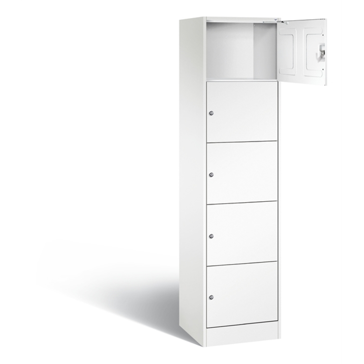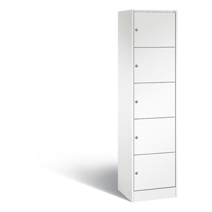 Stahl-Fächerschrank Serie 8070, XL, 1 Abteil mit 5 Fächern, Korpus aus stabiler Stahlkonstruktion mit hochwertiger Einbrennbeschichtung für hohe UV- und Korrosionsbeständigkeit, Türen doppelwandig für hohe Stabilität, Türaufhängung oben und unten in Drehbolzen, rechts angeschlagen, inkl. Türöffnungsbegrenzer 90 Grad, als Schutz vor Überdehnen der Tür, auf 100 mm hohem Sockel, 5 Zylinderschlösser mit je 2 Schlüsseln, Schließkreis bis 1000 verschiedene Schließungen, Maße (H x B x T): 1950 x 460 x 480 mm, Korpus: RAL 9016 Verkehrsweiß, Türen: RAL 9016 Verkehrsweiß