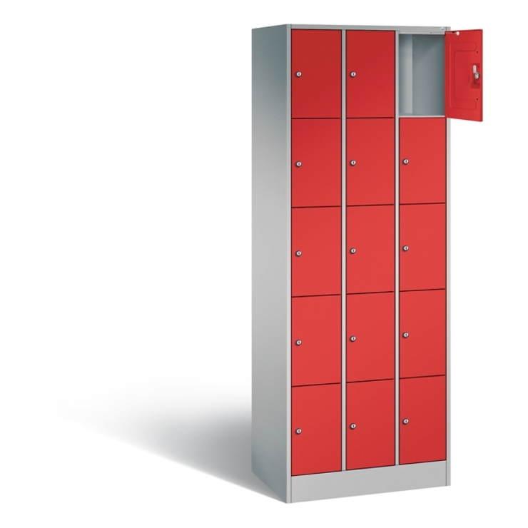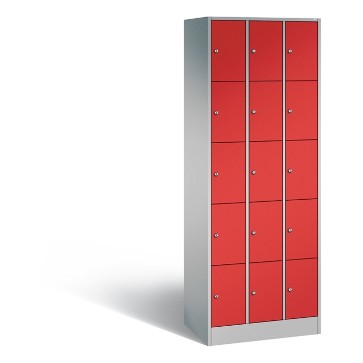 Stahl-Fächerschrank Serie 8070, 3 Abteile mit je 5 Fächern, Korpus aus stabiler Stahlkonstruktion mit hochwertiger Einbrennbeschichtung für hohe UV- und Korrosionsbeständigkeit, Türen doppelwandig für hohe Stabilität, Türaufhängung oben und unten in Drehbolzen, rechts angeschlagen, inkl. Türöffnungsbegrenzer 90 Grad, als Schutz vor Überdehnen der Tür, auf 100 mm hohem Sockel, 15 Zylinderschlösser mit je 2 Schlüsseln, Schließkreis bis 1000 verschiedene Schließungen, Maße (H x B x T): 1950 x 680 x 480 mm, Korpus: RAL 9006 Weißaluminium, Türen: RAL 3000 feuerrot