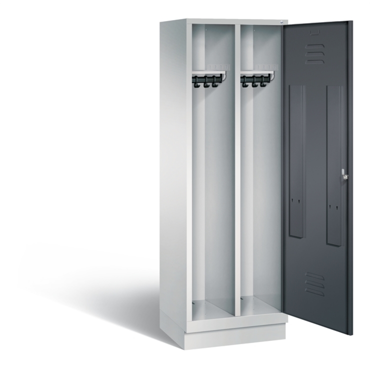 Stahl-Garderobenschrank Evolo, als Straßen- und Berufskleidungsschrank, 2 Abteile für 1 Person, Abteilbreite 300 mm, Türen zueinanderschlagend für gemeinsamen Verschluss, Korpus aus stabiler Stahlkonstruktion mit hochwertiger Einbrennbeschichtung für hohe UV- und Korrosionsbeständigkeit, innen 1 durchgehender Ablageboden, darunter je Abteil 1 stabile Garderobenstange aus Ovalprofil mit 3 verdrehsicheren Schiebehaken, Schrankboden hinten mit großflächigem Luftdurchlass für optimale... (mehr)? Papersmart hilft Ihnen, den besten Anbieter für Ihren gesamten Warenkorb zu ermitteln.