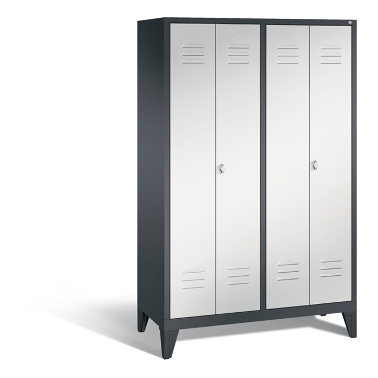 Stahl-Garderobenschrank Classic, als Straßen- und Berufskleidungsschrank 4 Abteile für 2 Personen, Abteilbreite 300 mm,Türen paarweise zueinanderschlagend für gemeinsamen Verschluss, Korpus aus stabiler Stahlkonstruktion mit hochwertiger Einbrennbeschichtung für hohe UV- und Korrosionsbeständigkeit, innen je Abteil 1 Ablageboden, darunter 1 stabile Garderobenstange aus Ovalprofil mit 3 verdrehsicheren Schiebehaken, Schrankboden hinten mit Lüftungsöffnungen für optimale Luftzirkulation, auf 150 mm hohen Füßen aus Kunststoff für erweiterten Korrosionsschutz, 2 Drehriegel für Vorhängeschlösser, Türen mit Anschlagsdämpfer und mittiger Verstärkung für hohe Stabilität, mit Lüftungschlitzen oben und unten sowie eingestanztem Etikettenrahmen, Türaufhängung in Drehbolzen, Maße (H x B x T): 1850 x 1190 x 500 mm, Korpus: RAL 7021 Schwarzgrau, Türen Stahl: RAL 7035 Lichtgrau, Inneneinrichtung: RAL 7021 Schwarzgrau, Füße: RAL 9005 Tiefschwarz