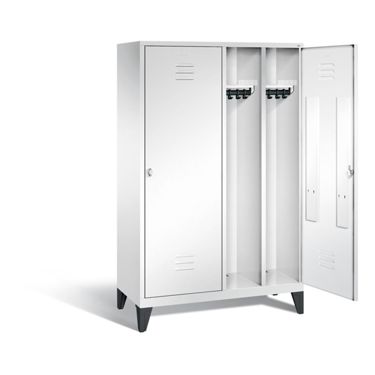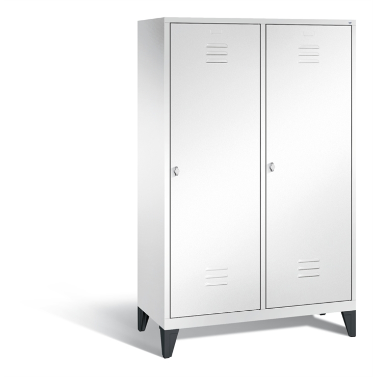 Stahl-Garderobenschrank Classic, als Straßen- und Berufskleidungsschrank, 4 Abteile für 2 Personen, Abteilbreite 300 mm, 2 Türen über 4 Abteile, Korpus aus stabiler Stahlkonstruktion mit hochwertiger Einbrennbeschichtung für hohe UV- und Korrosionsbeständigkeit, innen je Abteil 1 Ablageboden darunter 1 stabile Garderobenstange aus Ovalprofil mit 3 verdrehsicheren Schiebehaken, Schrankboden hinten mit Lüftungsöffnungen für optimale Luftzirkulation, auf 150 mm hohen Füßen aus Kunststoff für erweiterten Korrosionsschutz, 2 Drehriegel für Vorhängeschlösser, Türen mit Anschlagsdämpfer und mittiger Verstärkung für hohe Stabilität, mit Lüftungschlitzen oben und unten sowie eingestanztem Etikettenrahmen, Türaufhängung in Drehbolzen, Maße (H x B x T): 1850 x 1190 x 500 mm, Korpus: RAL 9016 Verkehrsweiß, Türen Stahl: RAL 9016 Verkehrsweiß, Inneneinrichtung: RAL 9016 Verkehrsweiß, Füße: RAL 9005 Tiefschwarz