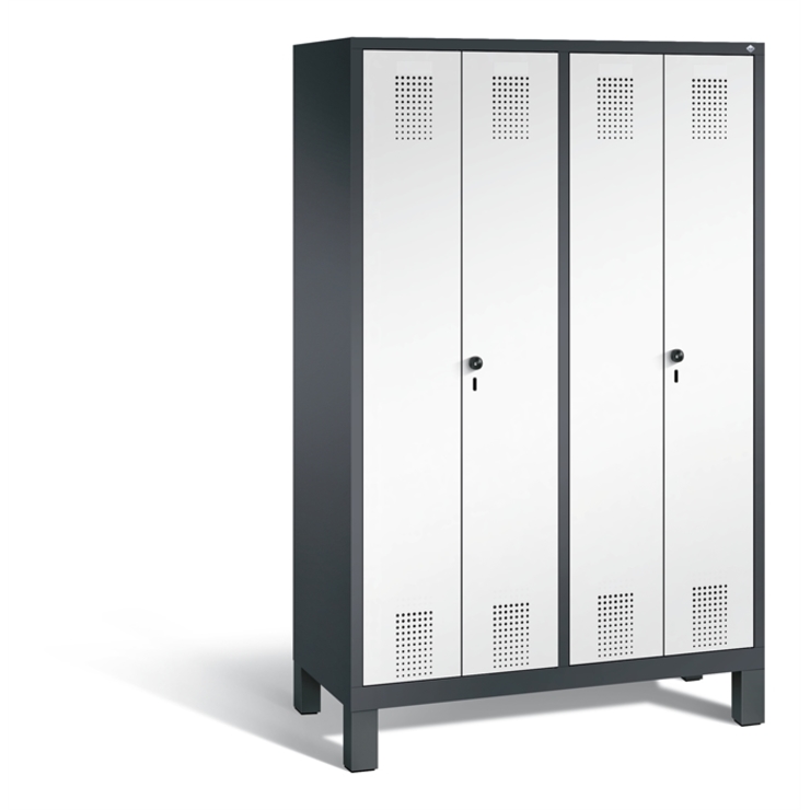 Stahl-Garderobenschrank Evolo, als Straßen- und Berufskleidungsschrank, 4 Abteile für 2 Personen, Abteilbreite 300 mm, Türen paarweise zueinanderschlagend für gemeinsamen Verschluss, Korpus aus stabiler Stahlkonstruktion mit hochwertiger Einbrennbeschichtung für hohe UV- und Korrosionsbeständigkeit, innen je Doppelabteil 1 durchgehender Ablageboden, darunter je Abteil 1 stabile Garderobenstange aus Ovalprofil mit 3 verdrehsicheren Schiebehaken, Schrankboden hinten mit großflächigem Luftdurchlass für optimale Luftzirkulation, auf 150 mm hohen Füßen aus Kunststoff für erweiterten Korrosionsschutz, mit integrierter Niveauregulierung und Schutzhülsen zur stilvollen Abdeckung der Verstellschrauben, bequem von innen und außen verstellbar, 2 Ergonomische Sicherheits-Drehriegel für Vorhängeschlösser inkl. Tür-Schutz, Türen mit Anschlagsdämpfer und geschlossenen Seitenprofilen für höchste Stabilität und Einbruchsicherheit, mit reinigungsfreundlichem Belüftungslochbild oben und unten sowie eingeprägtem Etikettenrahmen, Türaufhängung in Drehbolzen, Maße (H x B x T): 1850 x 1190 x 500 mm, Korpus: RAL 7021 Schwarzgrau, Türen Stahl: RAL 9016 Verkehrsweiß, Füße: RAL 9005 Tiefschwarz, Inneneinrichtung: RAL 7021 Schwarzgrau
