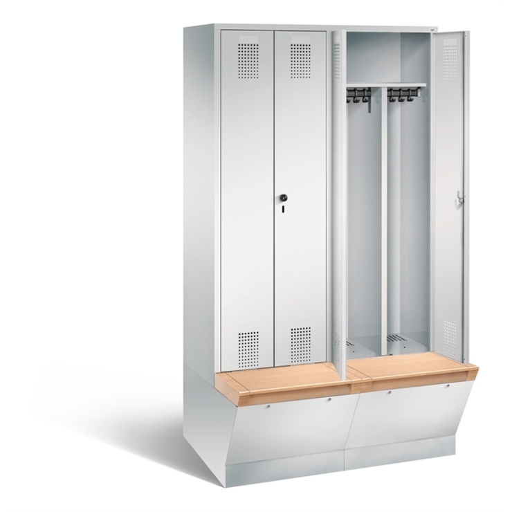 Stahl-Garderobenschrank Classic, 2 Abteile, Abteilbreite 400 mm, Korpus aus stabiler Stahlkonstruktion mit hochwertiger Einbrennbeschichtung für hohe UV- und Korrosionsbeständigkeit, innen je Abteil 1 Ablageboden, darunter 1 stabile Garderobenstange aus Ovalprofil mit 3 verdrehsicheren Schiebehaken, Schrankboden hinten mit Lüftungsöffnungen für optimale Luftzirkulation, auf 150 mm hohen Füßen aus Kunststoff für erweiterten Korrosionsschutz, 2 Zylinderschlösser mit je 2 Schlüsseln,... (mehr)? Papersmart hilft Ihnen, den besten Anbieter für Ihren gesamten Warenkorb zu ermitteln.