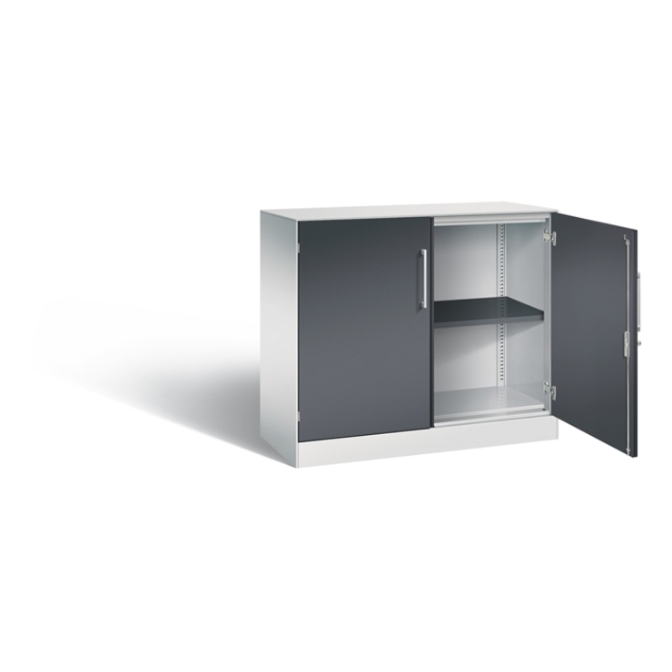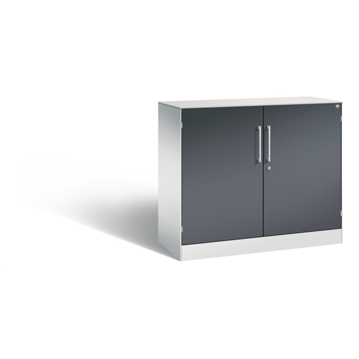 Stahl-Flügeltürenschrank Asisto, Korpus aus stabiler Stahlkonstruktion mit filigraner Kantenoptik und hochwertiger Einbrennbeschichtung für hohe UV-Beständigkeit, mit integrierter Niveauregulierung, bequem von innen bedienbar, hohe Flexibilität der Inneneinrichtung durch Höhenverstellbarkeit im 15 mm Raster, 1 Wechselzylinder matt vernickelt mit 2 Schlüsseln, 2 Ergonomische Design-Bügelgriffe für einfache Bedienung, aus Metall, matt vernickelt, 1 Abdeckplatte aus Stahl, 2 Stahltüren... (mehr)? Papersmart hilft Ihnen, den besten Anbieter für Ihren gesamten Warenkorb zu ermitteln.