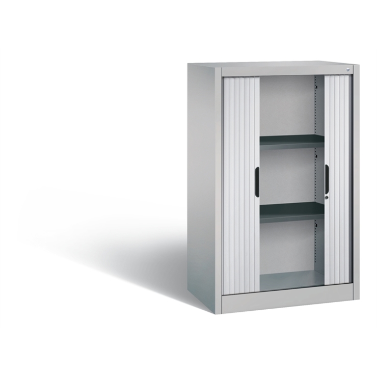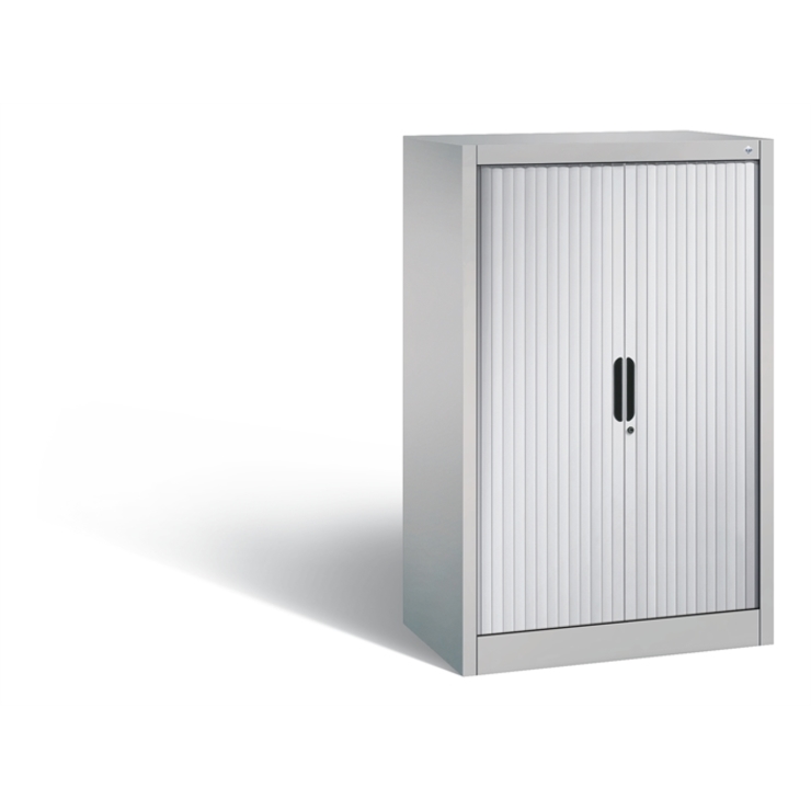 Stahl-Rollladenschrank Omnispace, als Sideboard, Korpus aus stabiler Stahlkonstruktion mit hochwertiger Einbrennbeschichtung für hohe UV-Beständigkeit, mit Kunststoffgleitern als praktischer Schrank- und Fußbodenschutz, hohe Flexibilität der Inneneinrichtung durch Höhenverstellbarkeit im 15 mm Raster, Türen aus durchgehenden, flexiblen Kunststoff- Lamellen (Polypropylen) in Leichtlaufschienen, mit Aluminiumschlossleiste und praktischer Griffmulde für einfache Bedienung, 1 integrierte Niveauregulierung bis 10 mm, bequem von innen justierbar, 1 Drehzylinderschloss mit 2 Schlüsseln, 2 Einlegeböden aus Stahl, lackiert, mit hoher Traglast von 50 kg, Maße (H x B x T): 1230 x 800 x 420 mm, Korpus: RAL 9006 Weißaluminium, Rollladen: RAL 9006 Weißaluminium, Inneneinrichtung: RAL 7021 Schwarzgrau