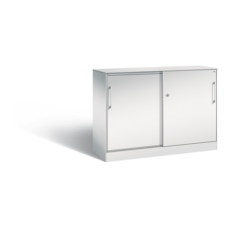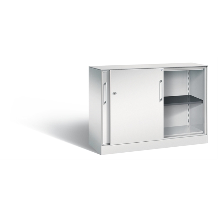 Stahl-Schiebetürenschrank Asisto, Korpus aus stabiler Stahlkonstruktion mit filigraner Kantenoptik und hochwertiger Einbrennbeschichtung für hohe UV-Beständigkeit, mit integrierter Niveauregulierung, bequem von innen bedienbar, hohe Flexibilität der Inneneinrichtung durch Höhenverstellbarkeit im 15 mm Raster, 1 Wechselzylinder matt vernickelt mit 2 Schlüsseln, 2 Ergonomische Design-Bügelgriffe für einfache Bedienung, aus Metall, matt vernickelt, 1 Abdeckplatte aus Stahl, 2 Stahltüren... (mehr)? Papersmart hilft Ihnen, den besten Anbieter für Ihren gesamten Warenkorb zu ermitteln.