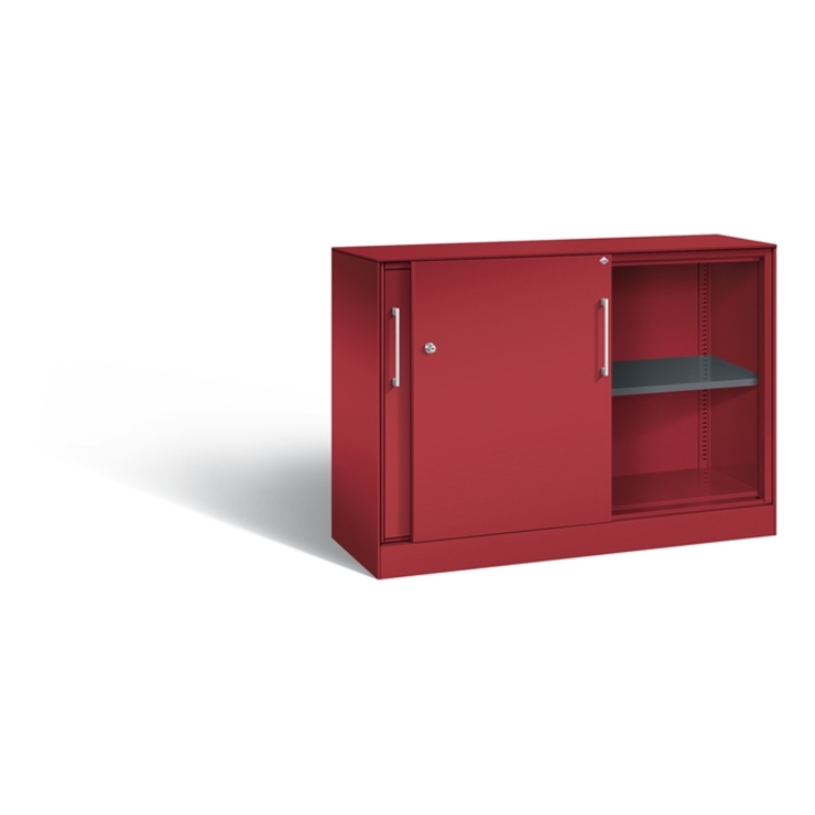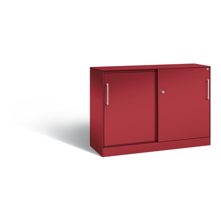 Stahl-Schiebetürenschrank Asisto, als Sideboard, Korpus aus stabiler Stahlkonstruktion mit filigraner Kantenoptik und hochwertiger Einbrennbeschichtung für hohe UV-Beständigkeit, mit integrierter Niveauregulierung, bequem von innen bedienbar, hohe Flexibilität der Inneneinrichtung durch Höhenverstellbarkeit im 15 mm Raster, 1 Wechselzylinder matt vernickelt mit 2 Schlüsseln, 2 Ergonomische Design-Bügelgriffe für einfache Bedienung, aus Metall, matt vernickelt, 1 Abdeckplatte aus Stahl, 2 Stahltüren doppelwandig, gedämmt für angenehmes Geräuschverhalten, leichtgängige Bedienung durch Leichtlaufrollen in spezieller Schienenführung, 1 Einlegeboden aus Stahl lackiert, mit hoher Traglast von 70 kg, Maße (H x B x T): 915 x 1200 x 435 mm, Korpus: RAL 3003 Rubinrot, Türen: RAL 3003 Rubinrot, Inneneinrichtung: RAL 7021 Schwarzgrau