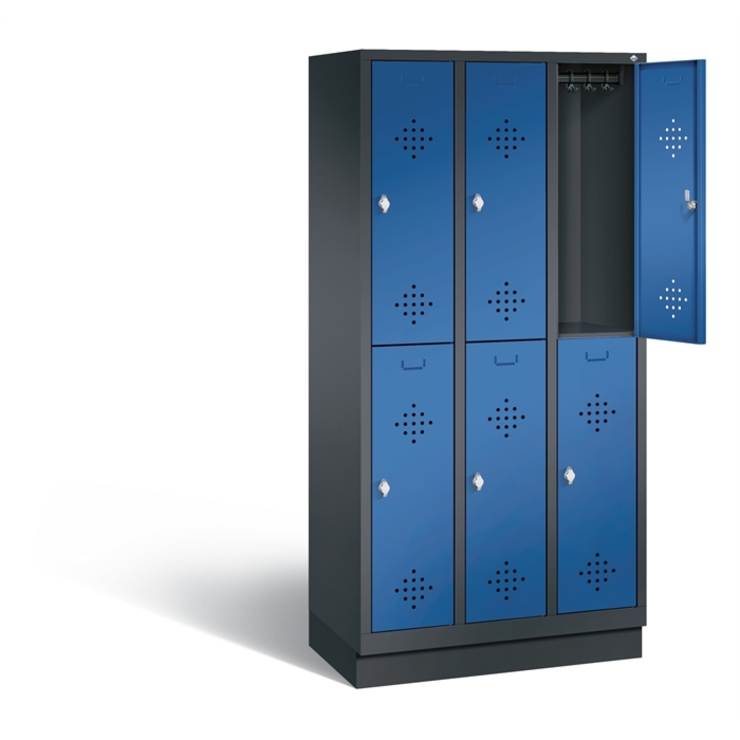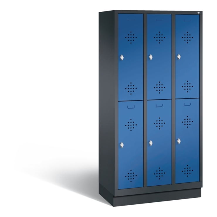 Doppelstöckiger Stahl-Garderobenschrank Classic, 3 Abteile mit 2 Fächern, Abteilbreite 300 mm, Korpus aus stabiler Stahlkonstruktion mit hochwertiger Einbrennbeschichtung für hohe UV- und Korrosionsbeständigkeit, innen je Fach 1 stabile Garderobenstange aus Ovalprofil mit 3 verdrehsicheren Schiebehaken, auf 100 mm hohem Sockel, mit Kunststoffgleitern als praktischer Schrank- und Fußbodenschutz, vorne zurückgesetzt, 6 Drehriegel für Vorhängeschlösser, 6 Türen mit Anschlagsdämpfer und mittiger Verstärkung für hohe Stabilität, mit reinigungsfreundlichem Belüftungslochbild oben und unten sowie eingeprägtem Etikettenrahmen, Türaufhängung in Drehbolzen, Maße (H x B x T): 1800 x 900 x 500 mm, Korpus: RAL 7021 Schwarzgrau, Türen Stahl: RAL 5010 Enzianblau