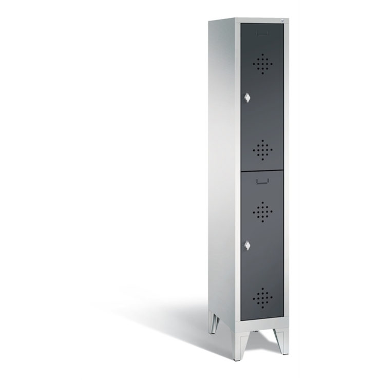 Doppelstöckiger Stahl-Garderobenschrank Classic, 1 Abteil mit je 2 Fächern, Abteilbreite 300 mm, Korpus aus stabiler Stahlkonstruktion mit hochwertiger Einbrennbeschichtung für hohe UV- und Korrosionsbeständigkeit, innen je Fach 1 stabile Garderobenstange aus Ovalprofil mit 3 verdrehsicheren Schiebehaken, auf 150 mm hohen Füßen, aus Kunststoff für optimalen Korrosionsschutz, 2 Drehriegel für Vorhängeschlösser, 2 Türen mit Anschlagsdämpfer und mittiger Verstärkung für hohe Stabilität, mit reinigungsfreundlichem Belüftungslochbild oben und unten sowie eingeprägtem Etikettenrahmen, Türaufhängung in Drehbolzen, Maße (H x B x T): 1850 x 320 x 500 mm, Korpus: RAL 7035 Lichtgrau, Türen Stahl: RAL 7021 Schwarzgrau, Füße: RAL 7035 Lichtgrau