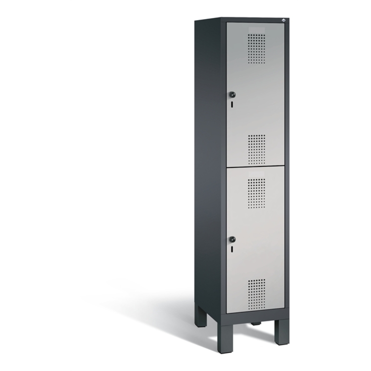 Doppelstöckiger Stahl-Garderobenschrank Evolo, 1 Abteil mit 2 Fächern, Abteilbreite 400 mm, Korpus aus stabiler Stahlkonstruktion mit hochwertiger Einbrennbeschichtung für hohe UV- und Korrosionsbeständigkeit, innen je Fach 1 stabile Garderobenstange aus Ovalprofil mit 3 verdrehsicheren Schiebehaken, auf 150 mm hohen Füßen aus Kunststoff für erweiterten Korrosionsschutz, mit integrierter Niveauregulierung und Schutzhülsen zur stilvollen Abdeckung der Verstellschrauben, bequem von innen und außen verstellbar, 2 Ergonomische Sicherheits-Drehriegel für Vorhängeschlösser inkl. Tür-Schutz, Türen mit Anschlagsdämpfer und geschlossenen Seitenprofilen für höchste Stabilität und Einbruchsicherheit, mit reinigungsfreundlichem Belüftungslochbild oben und unten sowie eingeprägtem Etikettenrahmen, Türaufhängung in Drehbolzen, Maße (H x B x T): 1850 x 420 x 500 mm, Korpus: RAL 7021 Schwarzgrau, Türen Stahl: RAL 9006 Weißaluminium, Füße: RAL 9005 Tiefschwarz