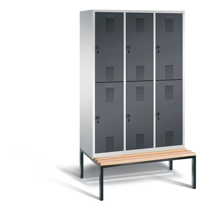 Doppelstöckiger Stahl-Garderobenschrank Evolo, 3 Abteile mit je 2 Fächern, Abteilbreite 400 mm, Korpus aus stabiler Stahlkonstruktion mit hochwertiger Einbrennbeschichtung für hohe UV- und Korrosionsbeständigkeit, innen je Fach 1 Ablageboden, darunter 1 stabile Garderobenstange aus Ovalprofil mit 3 verdrehsicheren Schiebehaken, auf untergebauter Sitzbank, Gestell aus stabilem Vierkant-Stahlrohr 30 x 30 mm, mit verstellbaren Bodengleitern für einfachen Niveauausgleich, 6 Ergonomische Sicherheits-Drehriegel für Vorhängeschlösser inkl. Tür-Schutz, Türen mit Anschlagsdämpfer und geschlossenen Seitenprofilen für höchste Stabilität und Einbruchsicherheit, mit reinigungsfreundlichem Belüftungslochbild oben und unten sowie eingeprägtem Etikettenrahmen, Türaufhängung in Drehbolzen, 1 Sitzleisten aus Buche-Hartholz, im Profil ca. 60 x 30 mm, allseitig gehobelt, oben abgerundet für guten Sitzkomfort, klarlackiert mit naturgegebenen Farbunterschieden, 1 Maße (H x B x T): 2090 x 1200 x 815 mm, Korpus: RAL 7035 Lichtgrau, Türen Stahl: RAL 7021 Schwarzgrau, Gestell: RAL 7021 Schwarzgrau