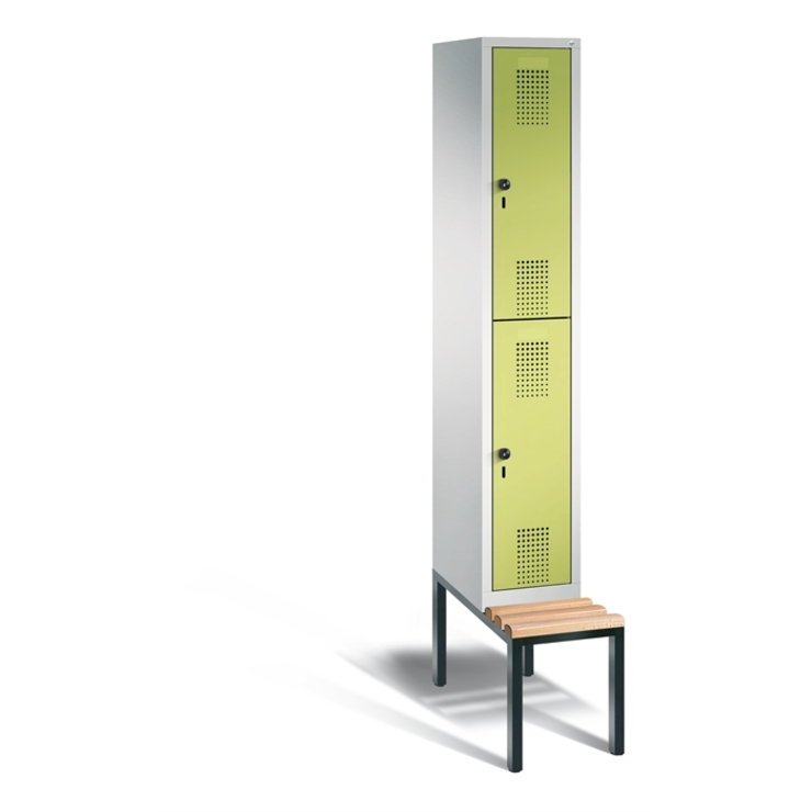 Doppelstöckiger Stahl-Garderobenschrank Evolo, 1 Abteil mit 2 Fächern, Abteilbreite 300 mm, Korpus aus stabiler Stahlkonstruktion mit hochwertiger Einbrennbeschichtung für hohe UV- und Korrosionsbeständigkeit, innen je Fach 1 Ablageboden, darunter 1 stabile Garderobenstange aus Ovalprofil mit 3 verdrehsicheren Schiebehaken, auf untergebauter Sitzbank, Gestell aus stabilem Vierkant-Stahlrohr 30 x 30 mm, mit verstellbaren Bodengleitern für einfachen Niveauausgleich, 2 Ergonomische Sicherheits-Drehriegel für Vorhängeschlösser inkl. Tür-Schutz, Türen mit Anschlagsdämpfer und geschlossenen Seitenprofilen für höchste Stabilität und Einbruchsicherheit, mit reinigungsfreundlichem Belüftungslochbild oben und unten sowie eingeprägtem Etikettenrahmen, Türaufhängung in Drehbolzen, 1 Sitzleisten aus Buche-Hartholz, im Profil ca. 60 x 30 mm, allseitig gehobelt, oben abgerundet für guten Sitzkomfort, klarlackiert mit naturgegebenen Farbunterschieden, 1 Maße (H x B x T): 2090 x 320 x 815 mm, Korpus: RAL 7035 Lichtgrau, Türen Stahl: 1108060 RDS Viridingrün, Gestell: RAL 7021 Schwarzgrau