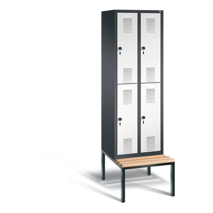 Doppelstöckiger Stahl-Garderobenschrank Evolo, 2 Abteile mit je 2 Fächern, Abteilbreite 300 mm, Korpus aus stabiler Stahlkonstruktion mit hochwertiger Einbrennbeschichtung für hohe UV- und Korrosionsbeständigkeit, innen je Fach 1 Ablageboden, darunter 1 stabile Garderobenstange aus Ovalprofil mit 3 verdrehsicheren Schiebehaken, auf untergebauter Sitzbank, Gestell aus stabilem Vierkant-Stahlrohr 30 x 30 mm, mit verstellbaren Bodengleitern für einfachen Niveauausgleich, 4 Ergonomische Sicherheits-Drehriegel für Vorhängeschlösser inkl. Tür-Schutz, Türen mit Anschlagsdämpfer und geschlossenen Seitenprofilen für höchste Stabilität und Einbruchsicherheit, mit reinigungsfreundlichem Belüftungslochbild oben und unten sowie eingeprägtem Etikettenrahmen, Türaufhängung in Drehbolzen, 1 Sitzleisten aus Buche-Hartholz, im Profil ca. 60 x 30 mm, allseitig gehobelt, oben abgerundet für guten Sitzkomfort, klarlackiert mit naturgegebenen Farbunterschieden, 1 Maße (H x B x T): 2090 x 610 x 815 mm, Korpus: RAL 7021 Schwarzgrau, Türen Stahl: RAL 9016 Verkehrsweiß, Gestell: RAL 7021 Schwarzgrau