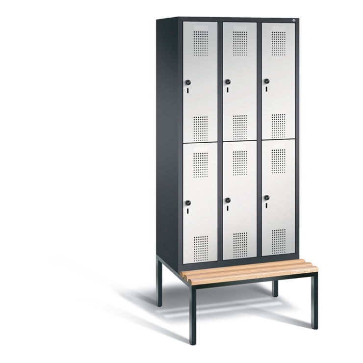 Doppelstöckiger Stahl-Garderobenschrank Evolo, 3 Abteile mit je 2 Fächern, Abteilbreite 300 mm, Korpus aus stabiler Stahlkonstruktion mit hochwertiger Einbrennbeschichtung für hohe UV- und Korrosionsbeständigkeit, innen je Fach 1 Ablageboden, darunter 1 stabile Garderobenstange aus Ovalprofil mit 3 verdrehsicheren Schiebehaken, auf untergebauter Sitzbank, Gestell aus stabilem Vierkant-Stahlrohr 30 x 30 mm, mit verstellbaren Bodengleitern für einfachen Niveauausgleich, 6 Ergonomische Sicherheits-Drehriegel für Vorhängeschlösser inkl. Tür-Schutz, Türen mit Anschlagsdämpfer und geschlossenen Seitenprofilen für höchste Stabilität und Einbruchsicherheit, mit reinigungsfreundlichem Belüftungslochbild oben und unten sowie eingeprägtem Etikettenrahmen, Türaufhängung in Drehbolzen, 1 Sitzleisten aus Buche-Hartholz, im Profil ca. 60 x 30 mm, allseitig gehobelt, oben abgerundet für guten Sitzkomfort, klarlackiert mit naturgegebenen Farbunterschieden, 1 Maße (H x B x T): 2090 x 900 x 815 mm, Korpus: RAL 7021 Schwarzgrau, Türen Stahl: RAL 7035 Lichtgrau, Gestell: RAL 7021 Schwarzgrau