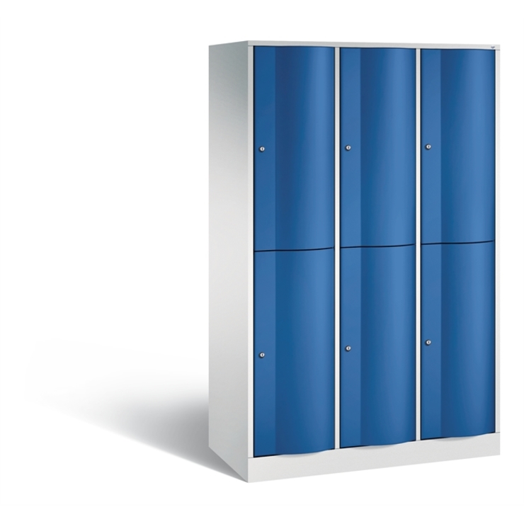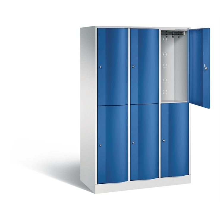 Doppelstöckiger Stahl-Garderobenschrank Resisto, 3 Abteile mit je 2 Fächern, Korpus aus stabiler Stahlkonstruktion mit hochwertiger Einbrennbeschichtung für hohe UV- und Korrosionsbeständigkeit, Spezialtüren aus 1,5 mm Stahl, mit Wölbung nach vorne, absolut stabil und vandalismussicher, mit Anschlagsdämpfer, Türaufhängung durchgängig mit robustem Drehstangen-Scharnier, rechts angeschlagen, innen je Fach 1 stabile Garderobenstange aus Ovalprofil mit 3 verdrehsicheren Schiebehaken, Rückwand mit großflächigem Luftdurchlass und 18 mm Wandabstandshaltern, auf 100 mm hohem Sockel mit 30 mm Niveauregulierung, 6 Drehzylinderschlösser mit 2 Schlüsseln, Schließkreis bis 6000 verschiedene Schließungen, Maße (H x B x T): 1950 x 1148 x 540 mm, Korpus: RAL 7035 Lichtgrau, Türen: RAL 5010 Enzianblau
