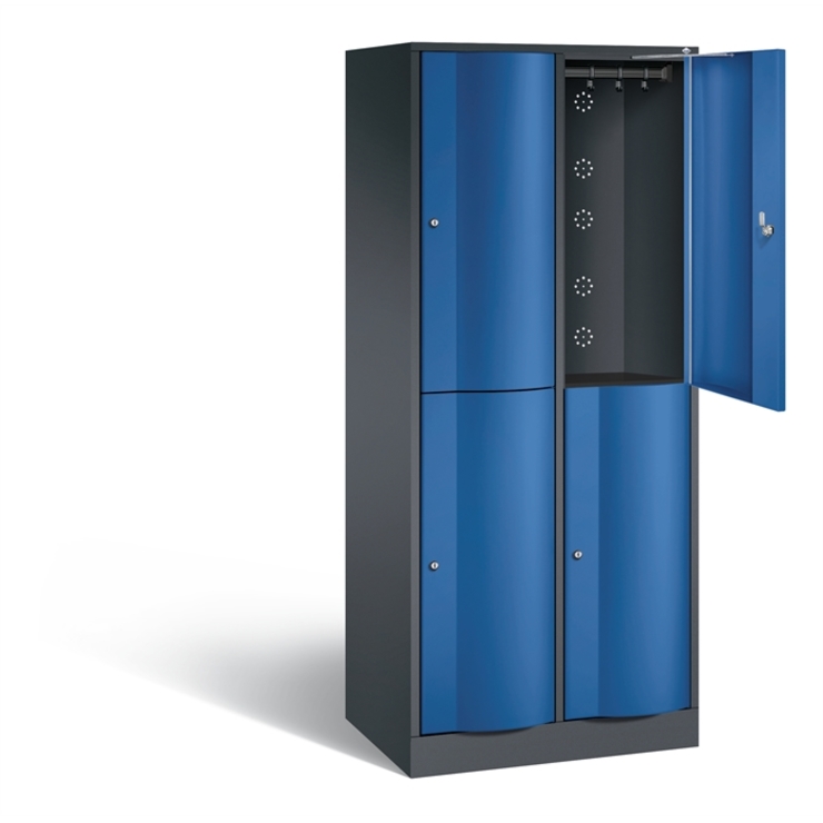 Doppelstöckiger Stahl-Garderobenschrank Resisto, 2 Abteile mit je 2 Fächern, Korpus aus stabiler Stahlkonstruktion mit hochwertiger Einbrennbeschichtung für hohe UV- und Korrosionsbeständigkeit, Spezialtüren aus 1,5 mm Stahl, mit Wölbung nach vorne, absolut stabil und vandalismussicher, mit Anschlagsdämpfer, Türaufhängung durchgängig mit robustem Drehstangen-Scharnier, rechts angeschlagen, innen je Fach 1 stabile Garderobenstange aus Ovalprofil mit 3 verdrehsicheren Schiebehaken, Rückwand mit großflächigem Luftdurchlass und 18 mm Wandabstandshaltern, auf 100 mm hohem Sockel mit 30 mm Niveauregulierung, 4 Drehzylinderschlösser mit 2 Schlüsseln, Schließkreis bis 6000 verschiedene Schließungen, Maße (H x B x T): 1950 x 772 x 540 mm, Korpus: RAL 7021 Schwarzgrau, Türen: RAL 5010 Enzianblau