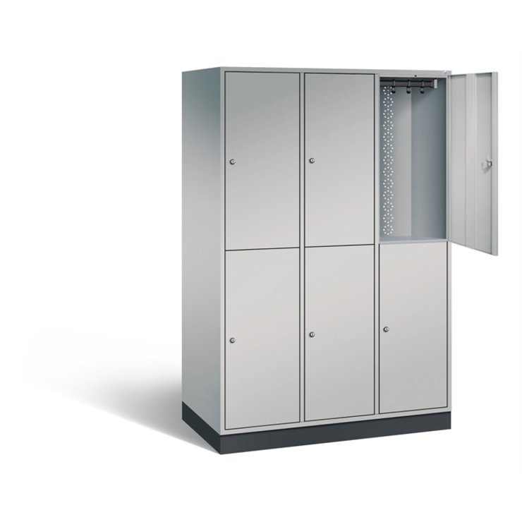 Doppelstöckiger Stahl-Garderobenschrank Intro, XL, 3 Abteile mit 2 Fächern, Abteilbreite 400 mm, Korpus aus stabiler Stahlkonstruktion mit hochwertiger Einbrennbeschichtung für hohe UV- und Korrosionsbeständigkeit, Türen verstärkt für hohe Stabilität, mit Anschlagsdämpfer, Türaufhängung durchgängig mit robustem Scharnierband, rechts angeschlagen, innen je Fach 1 Ablageboden und 1 stabile Garderobenstange aus Ovalprofil mit 3 verdrehsicheren Schiebehaken, Rückwand mit großflächigem... (mehr)? Papersmart hilft Ihnen, den besten Anbieter für Ihren gesamten Warenkorb zu ermitteln.